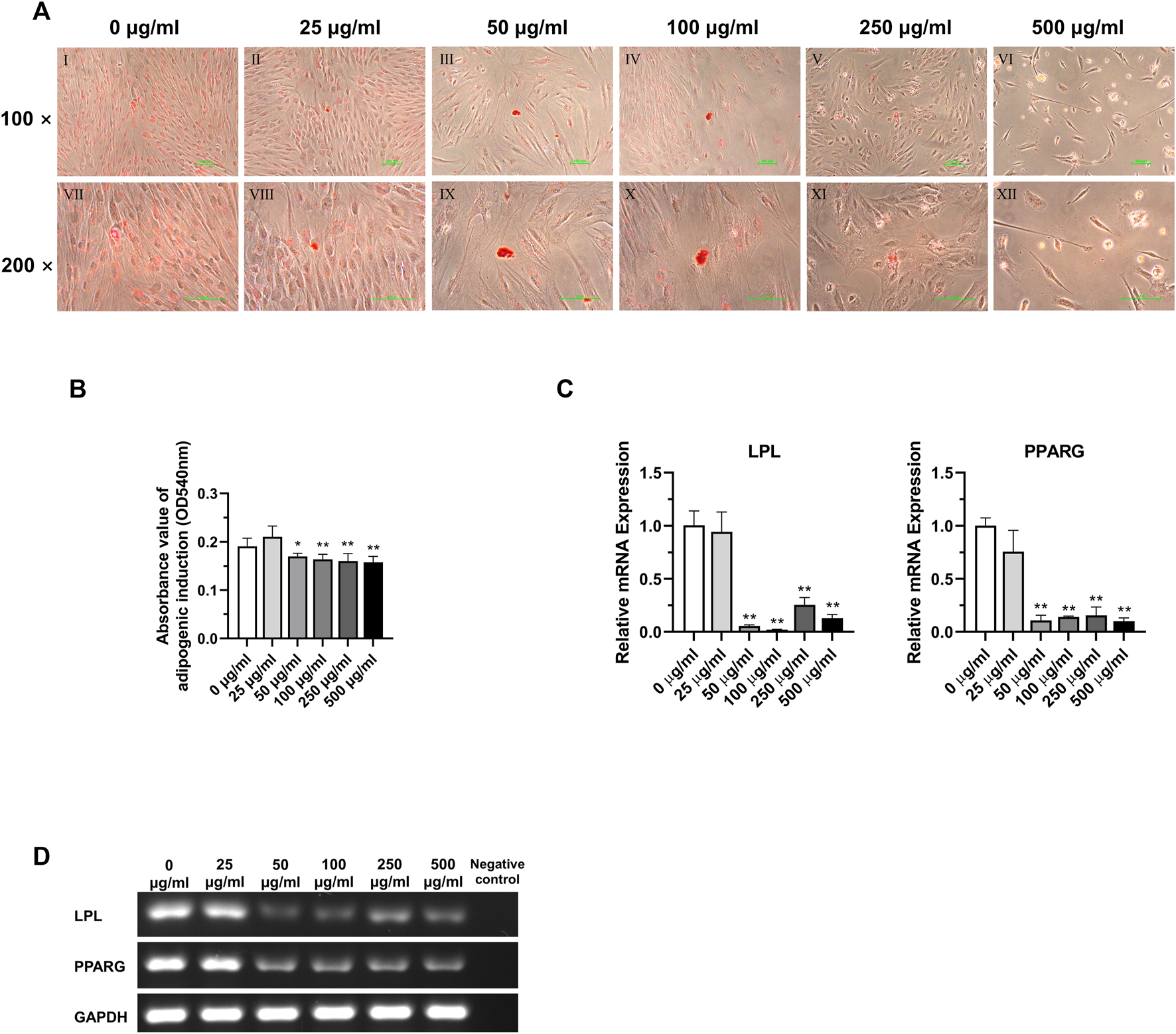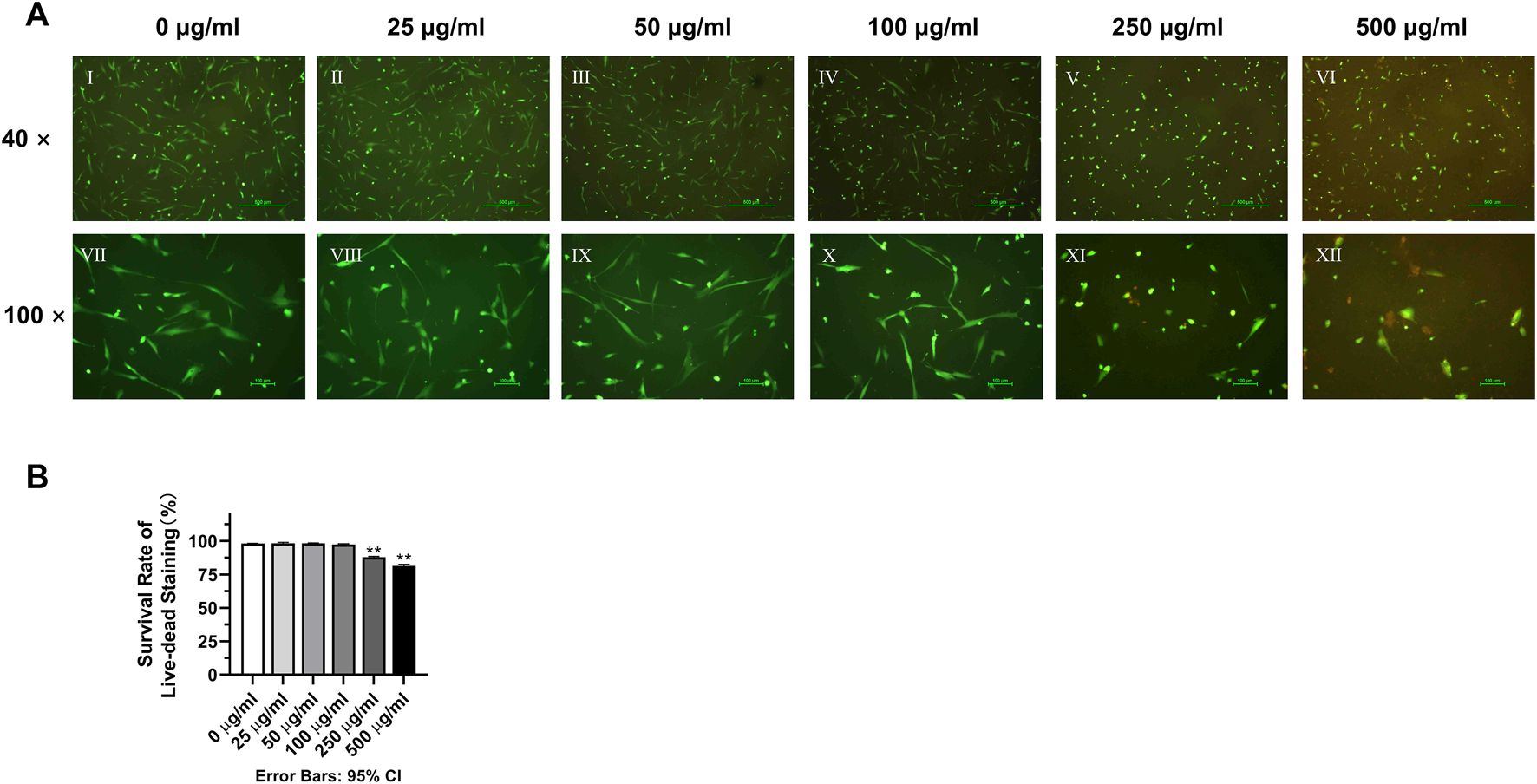 It can be clearly seen from the live-dead cell staining results that a higher number of PI red-stained dead cells appeared in the 250 μg/mL and 500 μg/mL groups (Figure 3A). The results of counting and statistical analysis showed that the percentage of live cells in the 250 μg/mL (88.01% ± 0.5834%) and 500 μg/mL (81.32% ± 1.285%) groups was lower than that in the 0 μg/mL blank control group (98.15% ± 0.1805%), and the difference was statistically significant (Figure 3B) (p < 0.01).