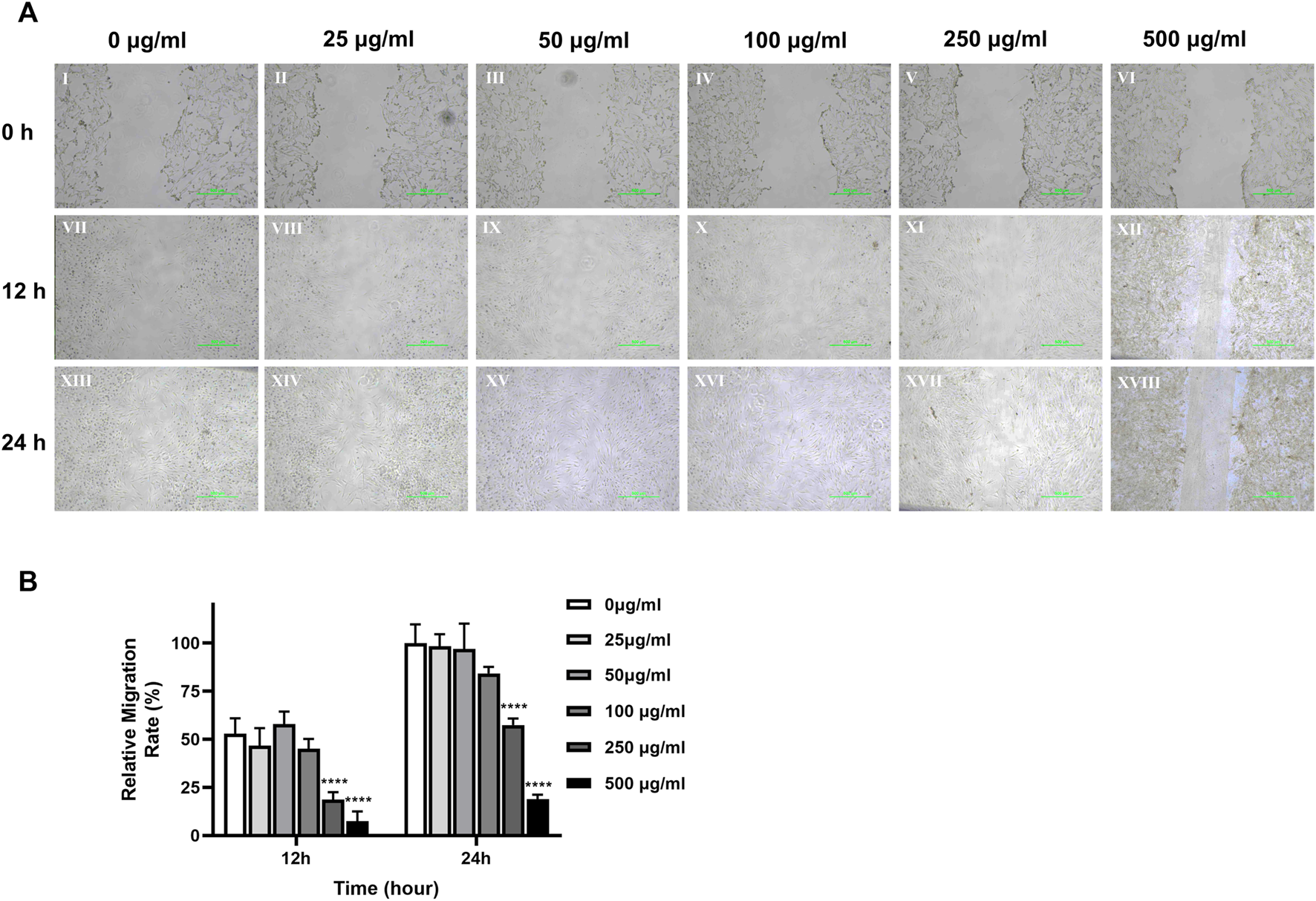 Cell migration ability of dental pulp cells in different concentration TCH groups. (A) Photographs of monolayer DPSC were taken at 0h, 12h and 24 h after scratching and adding different concentrations of TCH. Ⅰ–Ⅵ: 0–500 μg/mL (×40). Ⅶ–Ⅻ: 0–500 μg/mL (×100). (B) The area of the scratches in different groups at each time point was measured using ImageJ software, which was normalized to calculate the cell migration rate of each group relative to 0 h (n = 3). The two-way ANOVA was used in multiple group data analysis. ∗∗∗∗ p < 0.0001 vs. control (0 μg/mL).