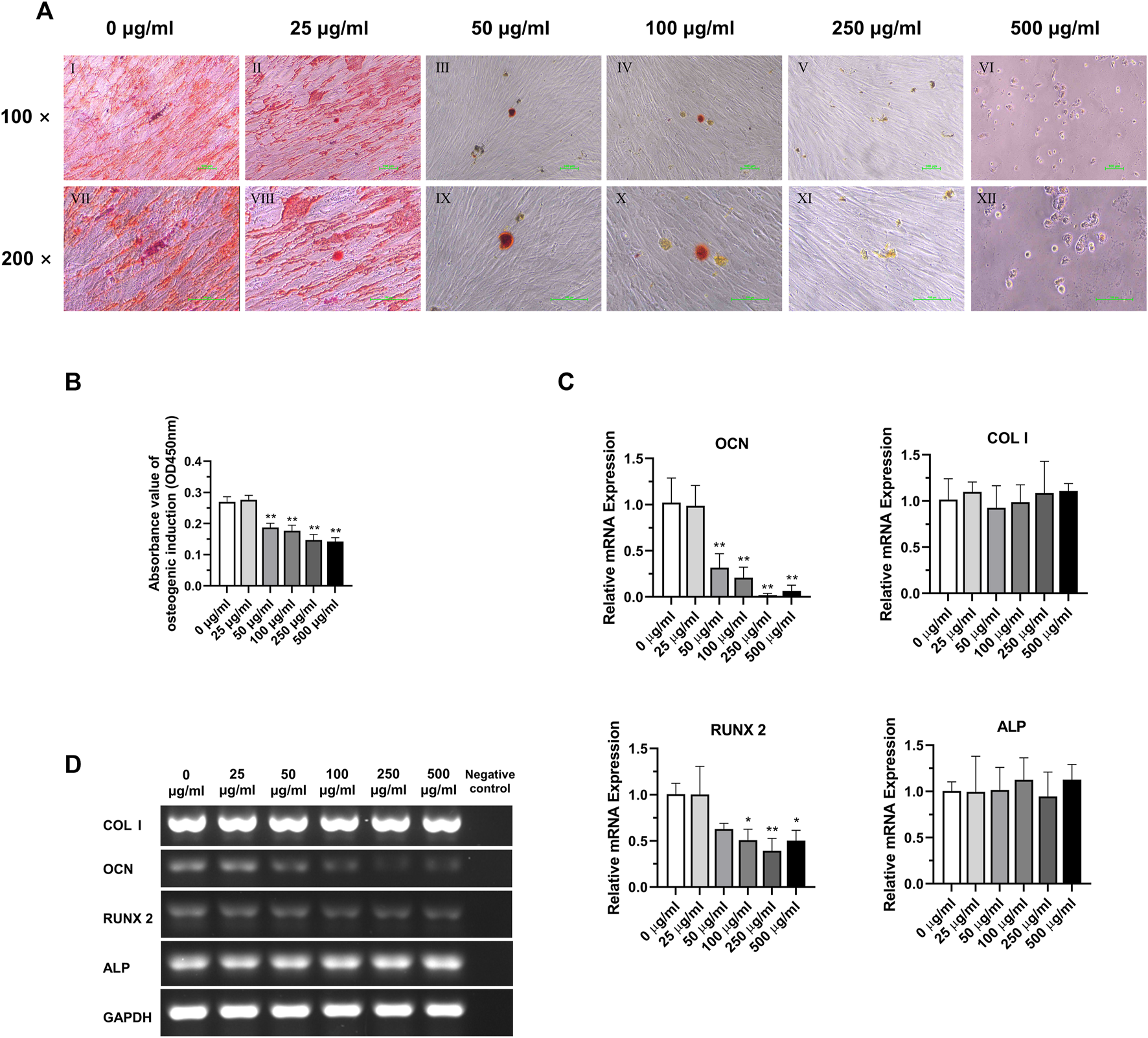 Osteogenic differentiation potential of DPSC in TCH. (A) Alizarin Red staining after osteogenic differentiation results of DPSC. Ⅰ–Ⅵ: 0–500 μg/mL (×100). Ⅶ–Ⅻ: 0–500 μg/mL (×200). (B) The absorbance value at 450 nm of dissolved solution after Alizarin Red S staining in different groups (n = 3). (C) The relative osteogenic mRNA expression value in different groups (n = 3). (D) Gel electrophoresis results of osteogenic gene expression in different groups, GAPDH was selected as reference gene. The one-way ANOVA was used in multiple group data analysis. ∗ p < 0.05, ∗∗ p < 0.01 vs. control (0 μg/mL).