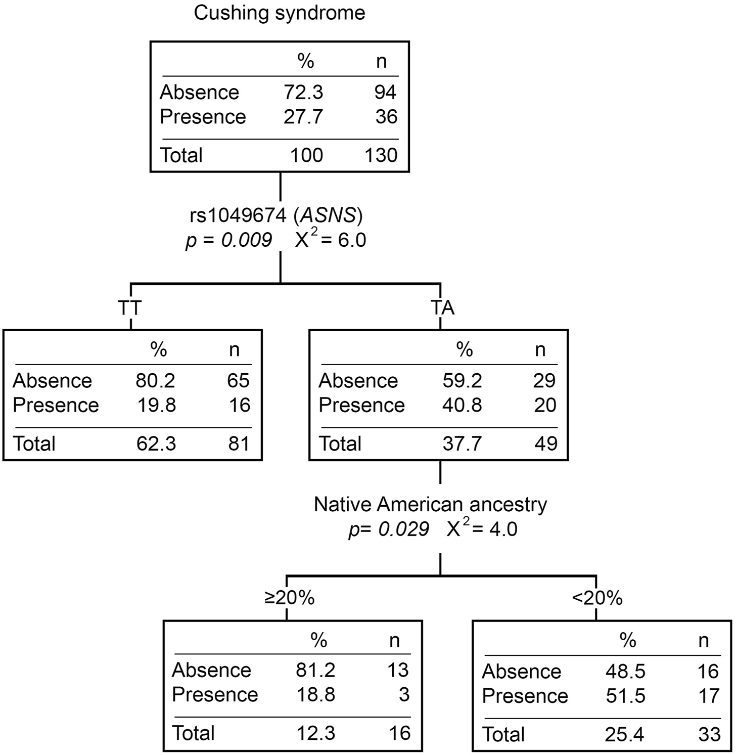 Cushing syndrome classification tree. The presence/absence of Cushing syndrome was considered the dependent variable. ABCB1 and ASNS genotypes, and Native American ancestry (greater or less than 20%) were considered independent variables. n, number of patients; p, p-value; X2, chi-square coefficient.