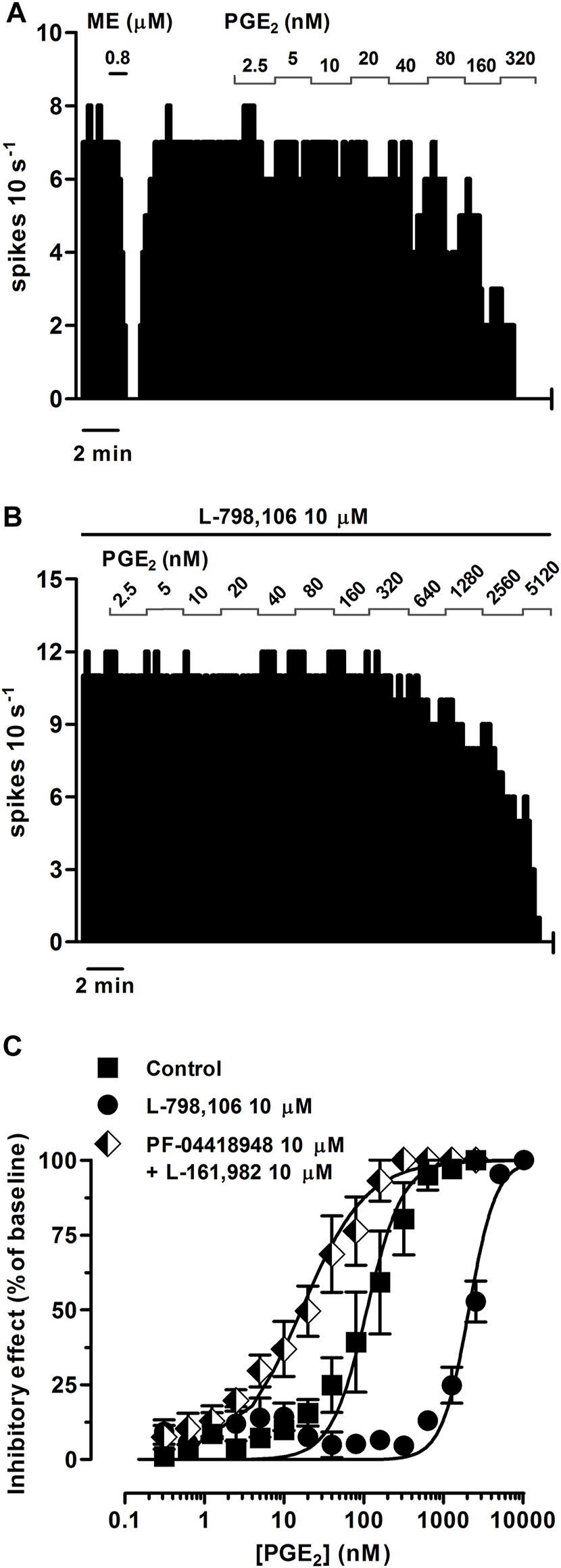 Effect of PGE2 on the firing rate of LC neurons in the absence or presence of the EP3 receptor antagonist L-798,106 or a combination of the EP2 receptor antagonist PF-04418948 and the EP4 receptor antagonist L-161,982. (A,B) Representative examples of firing rate recordings of two LC neurons showing the effect of increasing concentrations of PGE2 in the absence (A) and presence of L-798,106 (10 µM) (B). The vertical lines represent the number of spikes recorded every 10 s and the horizontal bars the period of drug application. (C) Concentration-effect curves for PGE2 in control (filled squares) and in the presence of L-798,106 (10 μM, filled circles) or PF-04418948 and L-161,982 (10 µM each, half-filled diamonds). The horizontal axis shows the PGE2 concentration on a semi-logarithmic scale. The vertical axis expresses the reduction in firing rate of LC neurons as the percentage of the baseline. Data points are the mean ± SEM at each PGE2 concentration obtained from n number of experiments. The lines through the data are the theoretical curves in each group constructed from the mean of the individual concentration-effect curve parameters, as estimated by nonlinear regressions. Note that the concentration-effect curve for PGE2 is shifted to the right by the EP3 receptor antagonist and to the left by the EP2 and EP4 receptor antagonists.