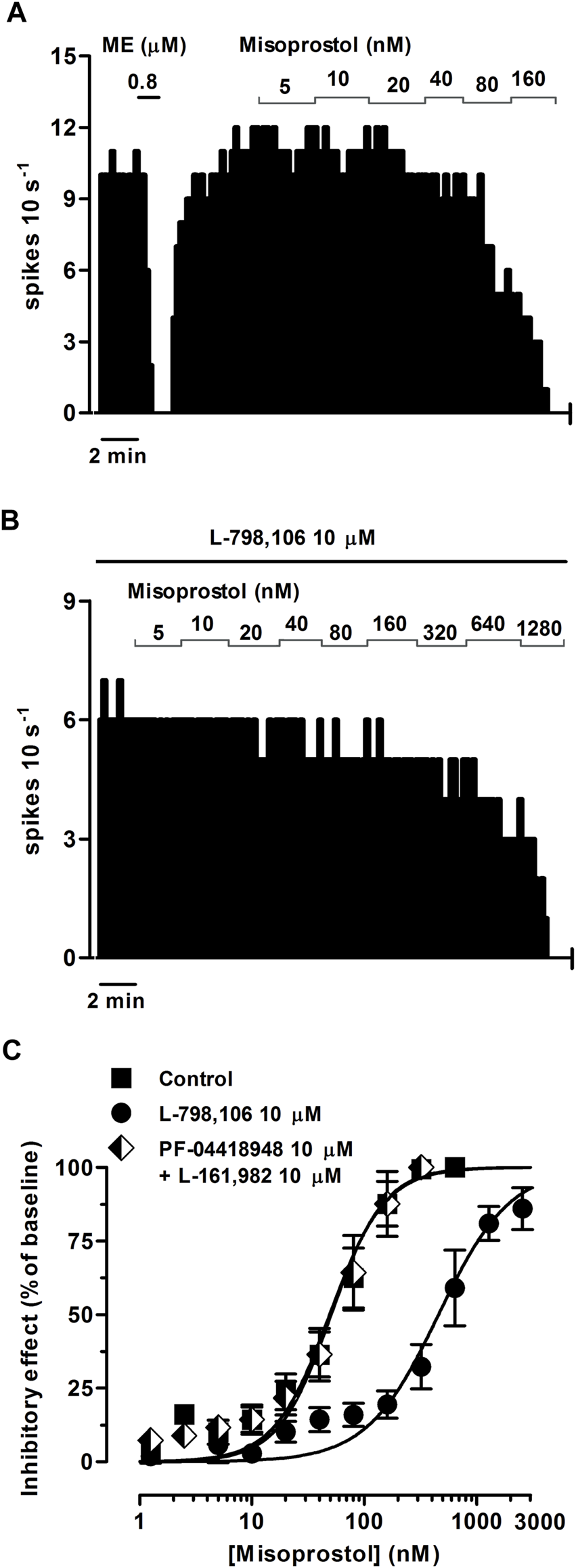 Effect of misoprostol on the firing rate of LC neurons in the absence or presence of the EP3 receptor antagonist L-798,106 or a combination of the EP2 receptor antagonist PF-04418948 and the EP4 receptor antagonist L-161,982. (A,B) Representative examples of firing rate recordings of two LC neurons showing the effect of increasing concentrations of misoprostol in the absence (A) and presence of L-798,106 (10 µM) (B). The vertical lines represent the number of spikes recorded every 10 s and the horizontal bars the period of drug application. (C) Concentration-effect curves for misoprostol in control (filled squares) and in the presence of L-798,106 (10 μM, filled circles) or PF-04418948 and L-161,982 (10 µM each, half-filled diamonds). The horizontal axis shows the misoprostol concentration on a semi-logarithmic scale. The vertical axis expresses the reduction in firing rate of LC neurons as the percentage of the baseline. Data points are the mean ± SEM at each misoprostol concentration obtained from n number of experiments. The lines through the data are the theoretical curves in each group constructed from the mean of the individual concentration-effect curve parameters, as estimated by nonlinear regressions. Note that the concentration-effect curve for misoprostol is shifted to the right by the EP3 receptor antagonist.