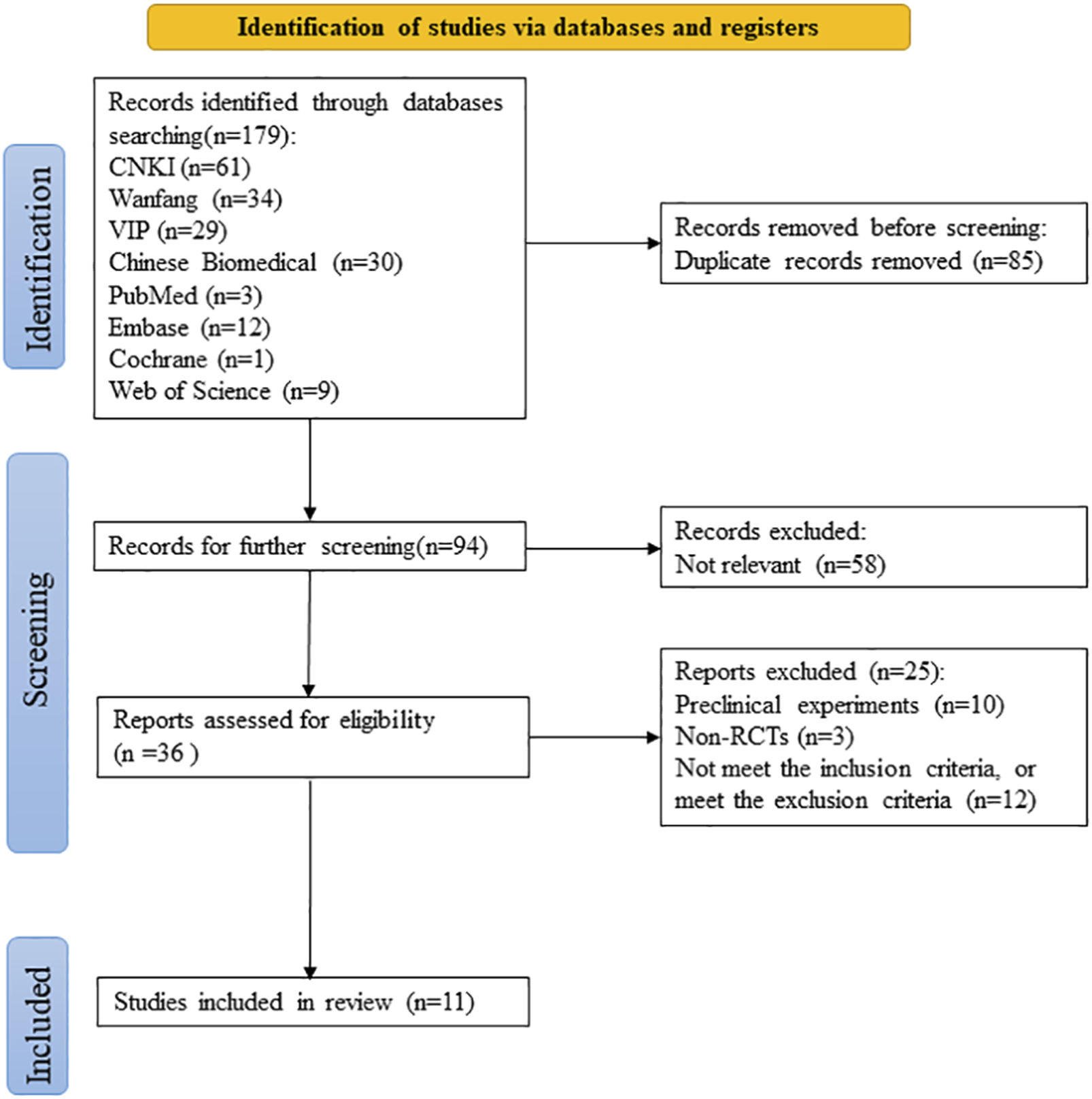The PRISMA flowchart of the literature screening process is presented in Figure 1. Initially, according to the search strategy, a total of 179 studies were obtained through retrieval from multiple databases; after the deletion of 85 duplicate publications, the remaining 94 articles were screened. After examination of the titles and abstracts, 58 irrelevant studies were removed. The full texts of the 36 remaining articles were assessed for eligibility. Preclinical studies (n = 10), non-RCTs (n = 3), and studies that did not meet the inclusion or met the exclusion criteria (n = 12) were excluded. Finally, 11 studies were included in the meta-analysis (Zou et al., 2018; Wang et al., 2020; Dong et al., 2021; Li et al., 2021; Zhang et al., 2021; Jiang et al., 2022; Kang, 2022; Zhang, 2022; Zhang et al., 2022; Zhou, 2022; Yan et al., 2023).