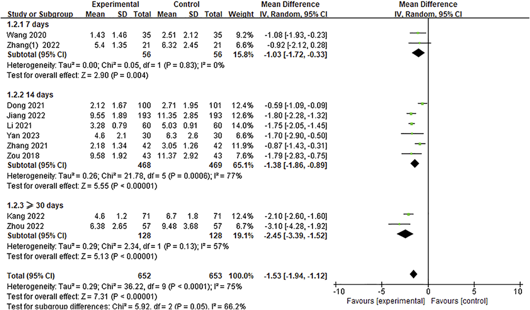 In these studies, the NIHSS score was evaluated at different treatment time periods, which ranged from 7 days to 90 days of treatment. Therefore, we used treatment duration to conduct further NIHSS evaluations (7 days, 14 days, and ≥30 days) as the criteria for the subgroup analysis. The results of the subgroup analysis are shown in Figure 4. It can be clearly seen that at the different time periods of 7 days, 14 days, and ≥30 days for implementing the NIHSS assessment, the NIHSS score of the experimental group was significantly lower than that of the control group [MD = −1.03, 95%CI = (−1.72, −0.33), p = 0.004; MD = −1.38, 95%CI = (−1.86, −0.89), p < 0.00001; MD = −2.45, 95%CI = (−3.39, −1.52), p < 0.00001, respectively]. The result of the subgroup differences (p = 0.05, I2 = 66.2%) indicated that this subgrouping factor might be a source of heterogeneity in the overall meta-analysis regarding the NIHSS score.