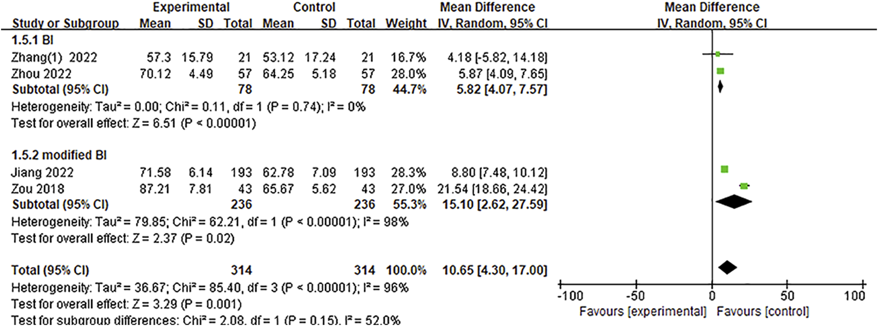 Four studies (Zou et al., 2018; Jiang et al., 2022; Zhang et al., 2022; Zhou, 2022) included the BI score. A meaningful increasing effect of Ani treatment was observed with the BI score level from the meta-analysis [MD = 10.65, 95%CI = (4.30, 17.00), p = 0.001]. Meanwhile, a significance between heterogeneity was observed (p < 0.00001, I2 = 96%); thus, a random-effect model was adopted for the meta-analysis (Figure 6). The test for subgroup differences between trials that adopted the BI measurement [two RCTs (Zhang et al., 2022; Zhou, 2022)] [MD = 5.82, 95%CI = (4.07, 7.57), p < 0.00001] and modified BI measurement [two RCTs (Zou et al., 2018; Jiang et al., 2022)] [MD = 15.10, 95%CI = (2.62, 27.59), p = 0.02] was non-significant (p = 0.15, I2 = 52%) (Figure 6).