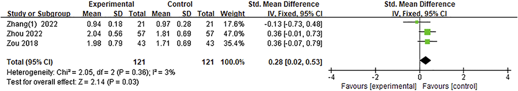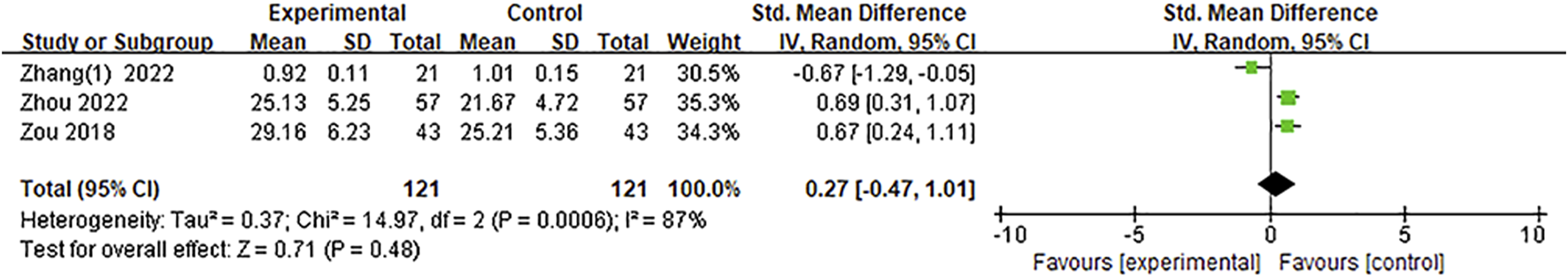 Three studies (Zou et al., 2018; Zhang et al., 2022; Zhou, 2022) reported the CTP, including relative cerebral blood flow (rCBF), relative cerebral blood volume (rCBV), relative time to peak (rTTP), and relative mean transit time (rMTT). The SMD was used as a summary statistic due to the consistency of the units in these studies being unclear. The pooled results indicated no statistically significant differences in the rCBF [SMD = 0.27, 95%CI = (−0.47, 1.01), p = 0.48] and rMTT [SMD = −0.71, 95%CI = (−2.20, 0.79), p = 0.35] between the Ani injection and the conventional therapy group and showed large heterogeneity (p = 0.0006, I2 = 87%; p < 0.00001, I2 = 96%, respectively) (Figures 7, 8). The effect of Ani injection on rCBF and rMTT, however, was not substantial. After sensitivity analysis by deleting one study (Zhang et al., 2022), the overall effect of Ani injection on rCBF and rMTT was significantly changed [SMD = 0.68, 95%CI = (0.40, 0.97), p < 0.00001; SMD = −1.57, 95%CI = (−1.89, −1.25), p < 0.00001, respectively]. Heterogeneity in both outcomes was also significantly reduced to 0%, which suggested that this study (Zhang et al., 2022) might be the source of the heterogeneity of the rCBF and rMTT data. Both the rCBV and rTTP levels were significantly changed by Ani injection therapy [SMD = 0.28, 95%CI = (0.02, 0.53), p = 0.03; SMD = −0.81, 95%CI = (−1.08, −0.55), p < 0.00001, respectively] without between-study heterogeneity (p = 0.36, I2 = 3%; p = 0.90, I2 = 0%, respectively) (Figures 9, 10).