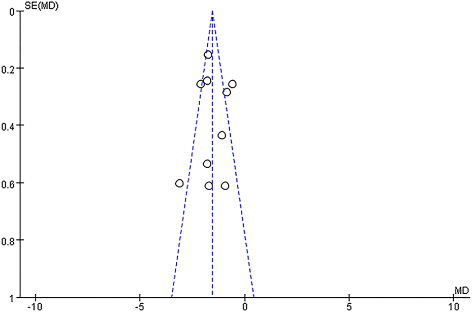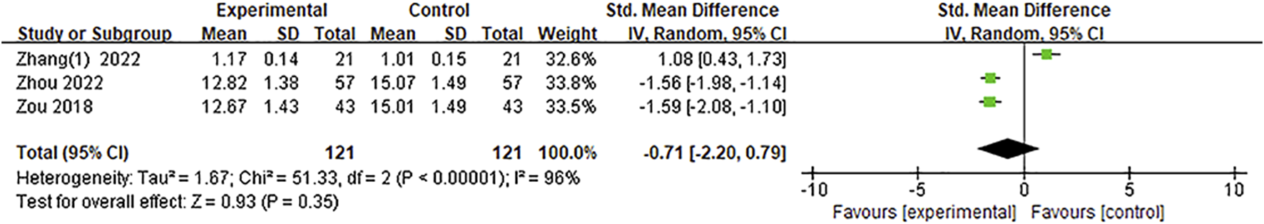 Eleven studies included the NIHSS score, of which one study (Zhang, 2022) did not report the post treatment NIHSS score; this data could not be extracted from the existing information. Thus, ten articles (Zou et al., 2018; Wang et al., 2020; Dong et al., 2021; Li et al., 2021; Zhang et al., 2021; Jiang et al., 2022; Kang, 2022; Zhang et al., 2022; Zhou, 2022; Yan et al., 2023) with 1,305 participants were included in the meta-analysis regarding the NIHSS score. The heterogeneity test results showed that p < 0.0001, I2 = 75%, and there was significant heterogeneity among the studies. Therefore, a random-effect model was adopted. The pooled results of the post-treatment NIHSS score indicated that compared with the control group, Ani injection could significantly reduce the NIHSS score after treatment [MD = −1.53, 95%CI = (−1.94, −1.12), p < 0.00001], as shown in Figure 4.
