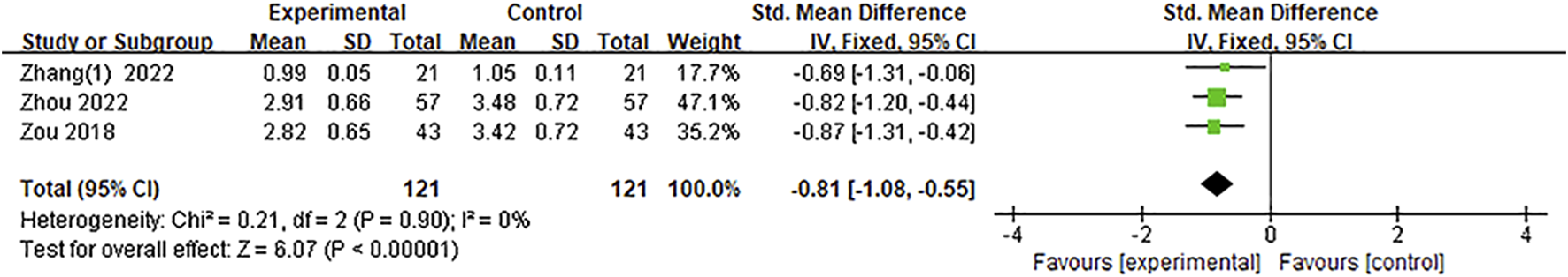 Five studies reported the mRS score; however, the data could not be extracted from one study (Dong et al., 2021) due to the provided data being dichotomous. Thus, a total of four studies (Wang et al., 2020; Kang, 2022; Zhang, 2022; Zhang et al., 2022) were included. The results of the heterogeneity test demonstrated that p = 0.81 and I2 = 0%; no significant heterogeneity was observed. Using the fixed-effect model, the results of the meta-analysis showed that the mRS score in the experimental group was significantly lower than that of the control group [MD = −0.89, 95%CI = (−0.97, −0.81), p < 0.00001], as shown in Figure 5.
