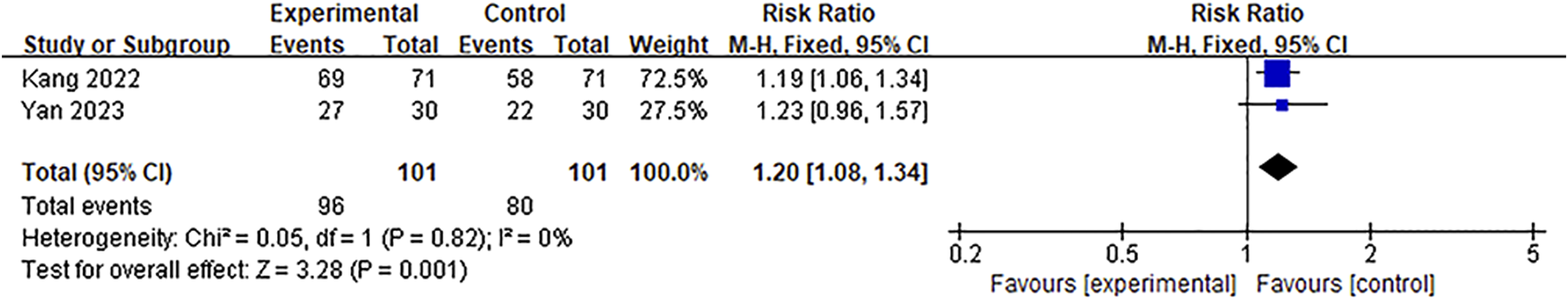 Two studies (Kang, 2022; Yan et al., 2023) reported the clinical effective rate, which was evaluated according to the NIHSS score for stroke patients. The heterogeneity test results showed that there was no significant heterogeneity among these studies (p = 0.82, I2 = 0%); therefore, the fixed-effect model was adopted. The pooled results showed that the effective rate of the Ani injection-treated group was significantly better than that of the conventional therapy group [RR = 1.2, 95%CI = (1.08, 1.34), p = 0.001] (Figure 11).
