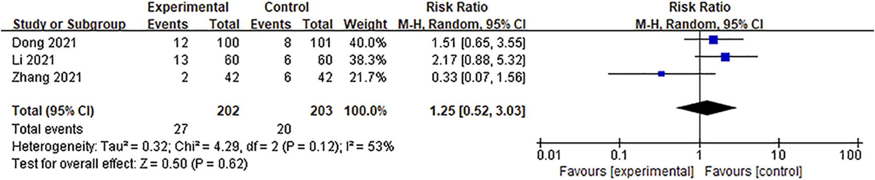 The other three articles (Dong et al., 2021; Li et al., 2021; Zhang et al., 2021) reported the incidence of adverse reactions. Using the random-effect model (p = 0.12, I2 = 53%) for the meta-analysis, the pooled results showed that there were no significant differences between the Ani injection supplemental group and the control group [RR = 1.25, 95%CI = (0.52, 3.03), p = 0.62] (Figure 12). Dong et al. (2021) observed 12 cases of dry mouth and facial flushing in the experimental group and 8 cases of nausea and vomiting in the control group. Zhang et al. (2021) reported 6 cases of nausea, vomiting, dry mouth, and facial flushing in the control group and 2 cases of nausea and vomiting in the experimental group. Li et al. (2021) found 2 cases of elevated alanine aminotransferase (ALT), 2 cases of dizziness, 3 cases of weakness, and 6 cases of gastrointestinal reactions in the experimental group and 1 case of elevated ALT, 1 case of weakness, and 4 cases of gastrointestinal reactions in the control group. Table 2 presents the adverse reactions of the involved studies.