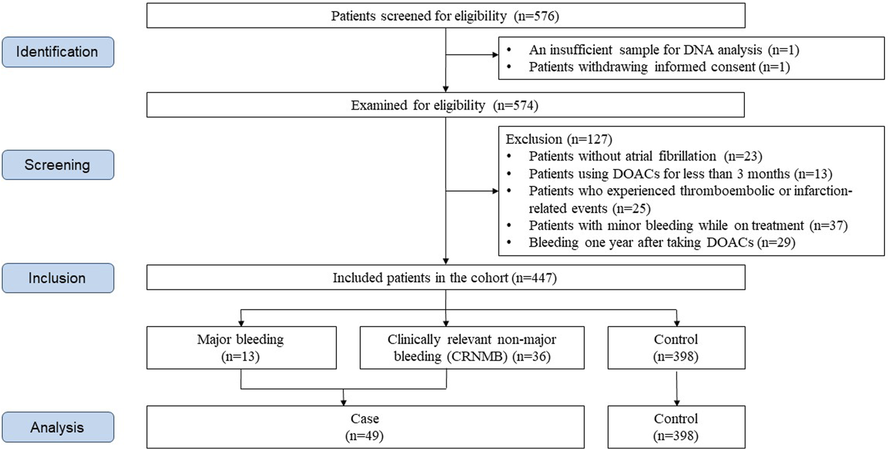 This retrospective cohort study was conducted at Ewha Womans University Mokdong Hospital and Ewha Womans University Seoul Hospital from June 2018 to December 2021. The study included patients diagnosed with AF who were administered DOACs (namely, apixaban, edoxaban, rivaroxaban, or dabigatran) for a minimum of 3 months. Patients were excluded if they: 1): experienced thromboembolic events during the study period, 2): experienced a bleeding event 1 year after taking DOACs, 3): had minor unverified bleeding events, 4): did not provide a sufficient DNA analysis sample, or 5): withdrew their informed consent. The primary outcome assessed in this study was major bleeding or clinically relevant non-major bleeding (CRNMB), as defined by criteria established by the International Society on Thrombosis and Haemostasis (ISTH) (Schulman et al., 2005; Kaatz et al., 2015). According to the guidelines, cases were considered to have experienced major bleeding if one of the following clinical manifestations was present in the medical chart: 1) fatal bleeding, 2) symptomatic bleeding in a critical organ, or 3) bleeding causing a decrease in hemoglobin level of 20 g/L or more or leading to transfusion of two or more units of white blood or red cells. Patients were recorded as having experienced CRNMB if they had a bleeding history that did not qualify as major bleeding and required any medical or surgical intervention to treat the bleeding.