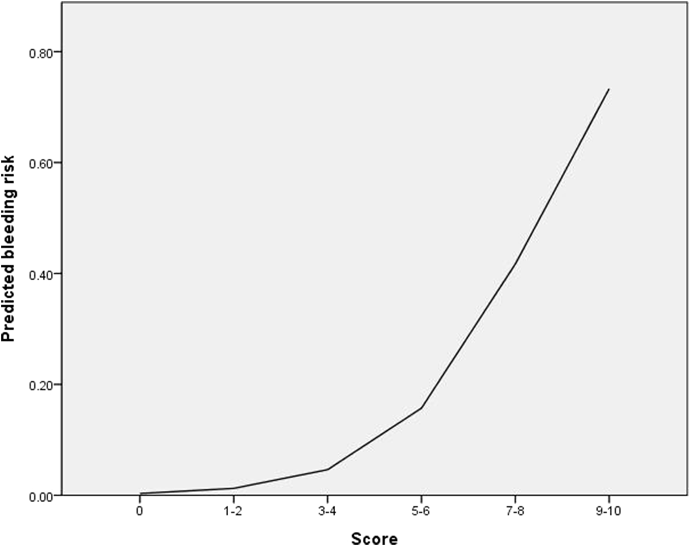Methods: This study was a retrospective analysis of prospectively collected samples. We selected ten SNPs within the RYR2 gene, and two models were constructed (Model I: demographic factors only, Model II: demographic and genetic factors) in multivariable analysis. Independent risk factors for bleeding were used to develop a risk scoring system.