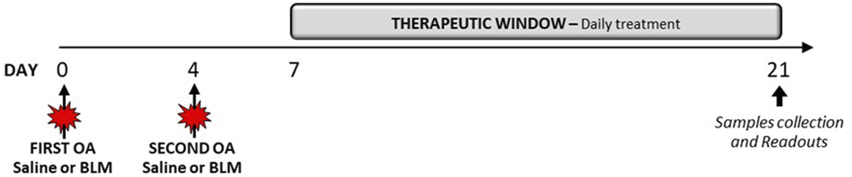 After the acclimatization period, mice were instilled via oropharyngeal aspiration (OA) under 4% isoflurane anesthesia with saline or BLM (BAXTER Oncology GmbH, Germany) solution (0.03 IU/mouse), at day 0 and day 4. Nintedanib Esylate (50 mg/kg), Pirfenidone (200 mg/kg), or Vehicle (1% Tween 80 in milliQ water) were administered orally twice daily for 2 weeks following a therapeutic protocol starting at day 7 after the first administration of BLM, until day 21 (Figure 1).