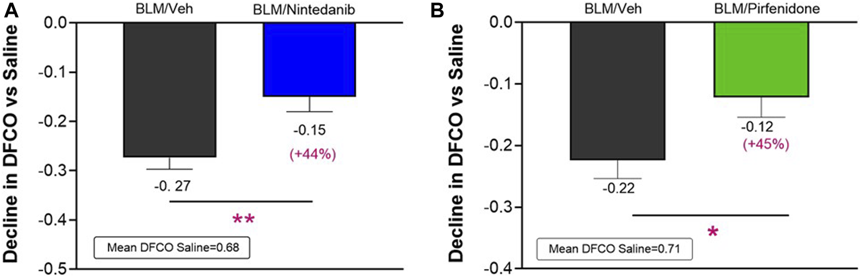 At day 21 BLM treatment alone led to a significant reduction in DFCO of −0.27 ± 0.02 and of −0.22 ± 0.03 compared to control animals (mean saline DFCO: 0.68 ± 0.02 and 0.71 ± 0.02) in Nintedanib and Pirfenidone studies, respectively. Nintedanib and Pirfenidone treatments significantly slowed down the decline in DFCO value by 44% (Figure 3A) and 45% (Figure 3B), respectively (Nintedanib group decline of 0.15 ± 0.03; difference vs. BLM: 0.12, p ≤ 0.01 and Pirfenidone group decline of 0.12 ± 0.03; difference vs. BLM: 0.10, p ≤ 0.05).