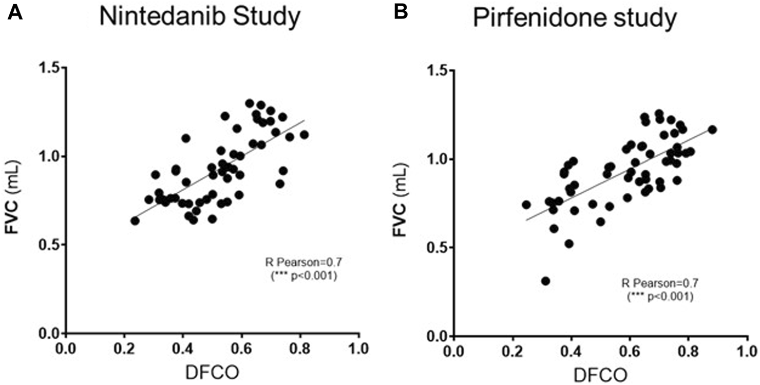 As shown in Figure 5, a significant correlation (R Pearson = 0.7, ***p ≤ 0.001 for both studies) was observed between FVC and DFCO values in all the animals of the different experimental groups.