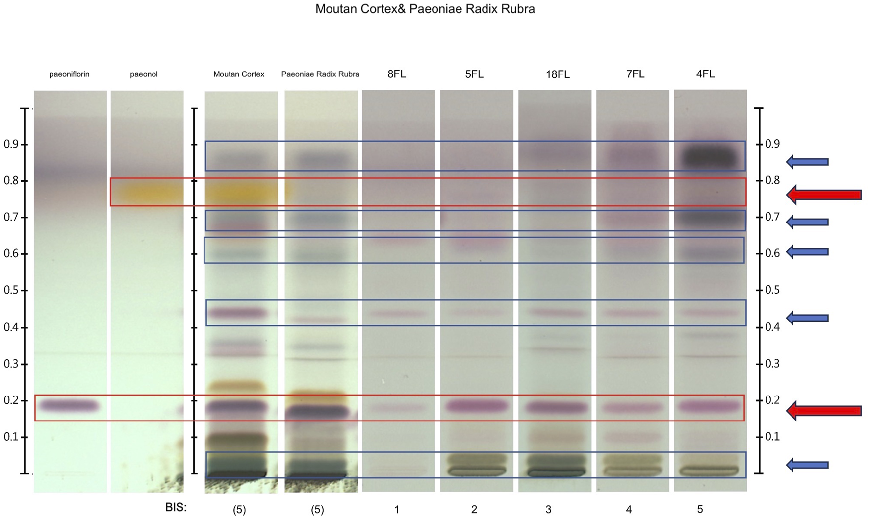 Example for the evaluation of Band Intensity Score (BIS) with scores 1-5 for formula FL with the ingredients of Moutan Cortex and Paeoniae Radix Rubra. Pharmacopoeial reference standards used are paeoniflorin (expected both in Moutan Cortex and Paeoniae Radix Rubra), paeonol (expected only in Moutan Cortex), and botanical references for each Moutan Cortex and Paeoniae Radix Rubra. Red arrows and frames highlight the bands corresponding to pharmacopoeial reference standards for Moutan Cortex and Paeoniae Radix Rubra. Here, paeonol is visible for Moutan Cortex, while all the multi-ingredient samples do not show this band. Paeoniflorin, the other reference standard, is visible in all samples, but with different intensities. Blue arrows and frames highlight the band patterns of the botanical references, which are the basis for a more representative fingerprint (“holistic”) and create, together with the reference standards, the fundament for the evaluation of BISs.