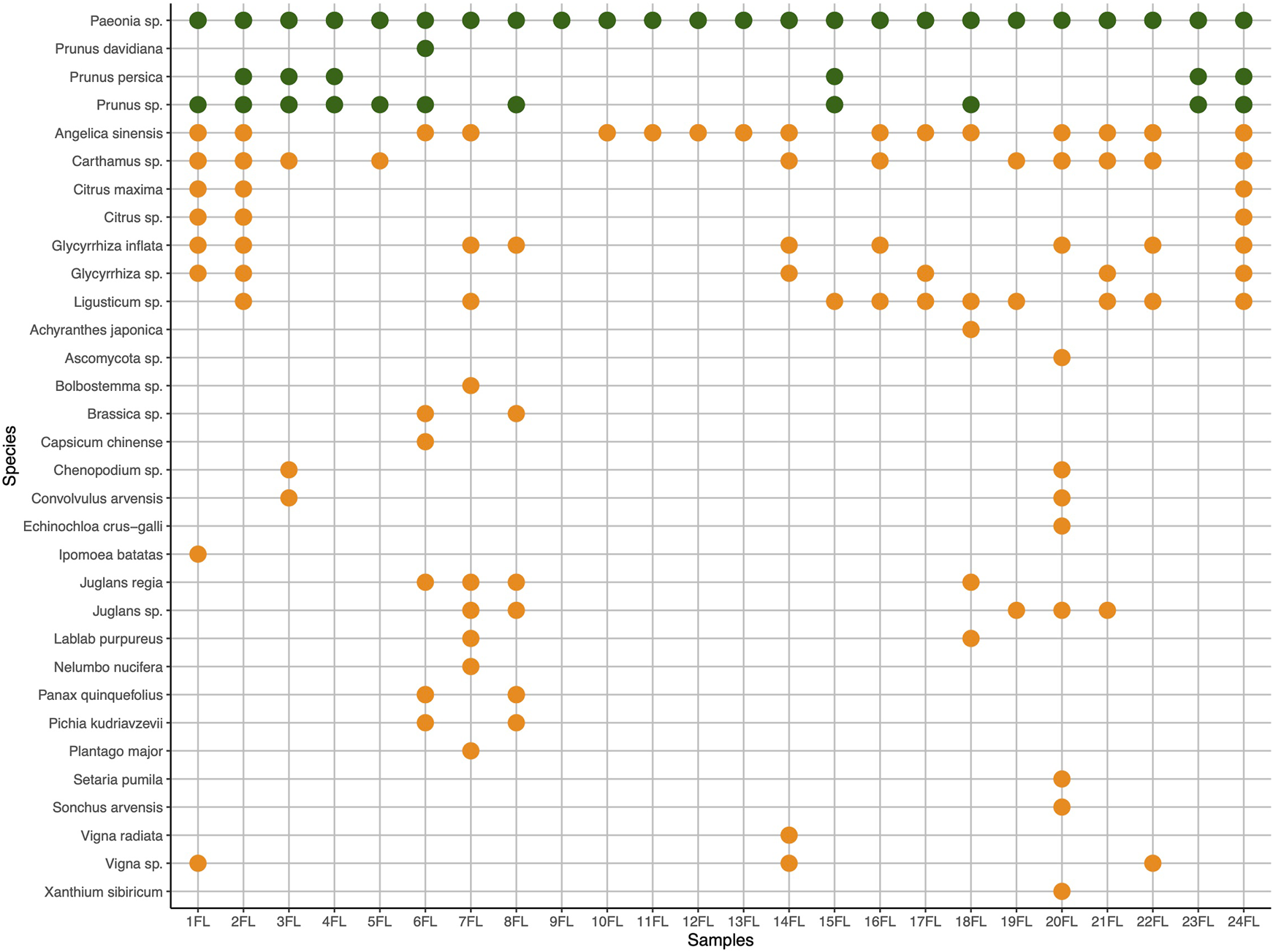Expected (green) and unexpected (orange) species authenticated in products and mixtures of formula Gui Zhi Fu Ling Wan (FL) using DNA metabarcoding. Undetected expected ingredients Cinnamomi Ramulus (Neolitsea cassia (L.) Kosterm., syn. Cinnamomum cassia Presl.) and Poria Cocos (Poria cocos (Schw.) Wolf), have zero identification hits and are not reported in the graphics. Ad hoc mixtures (AM) include samples 1-3FL, 23FL, and 24FL.