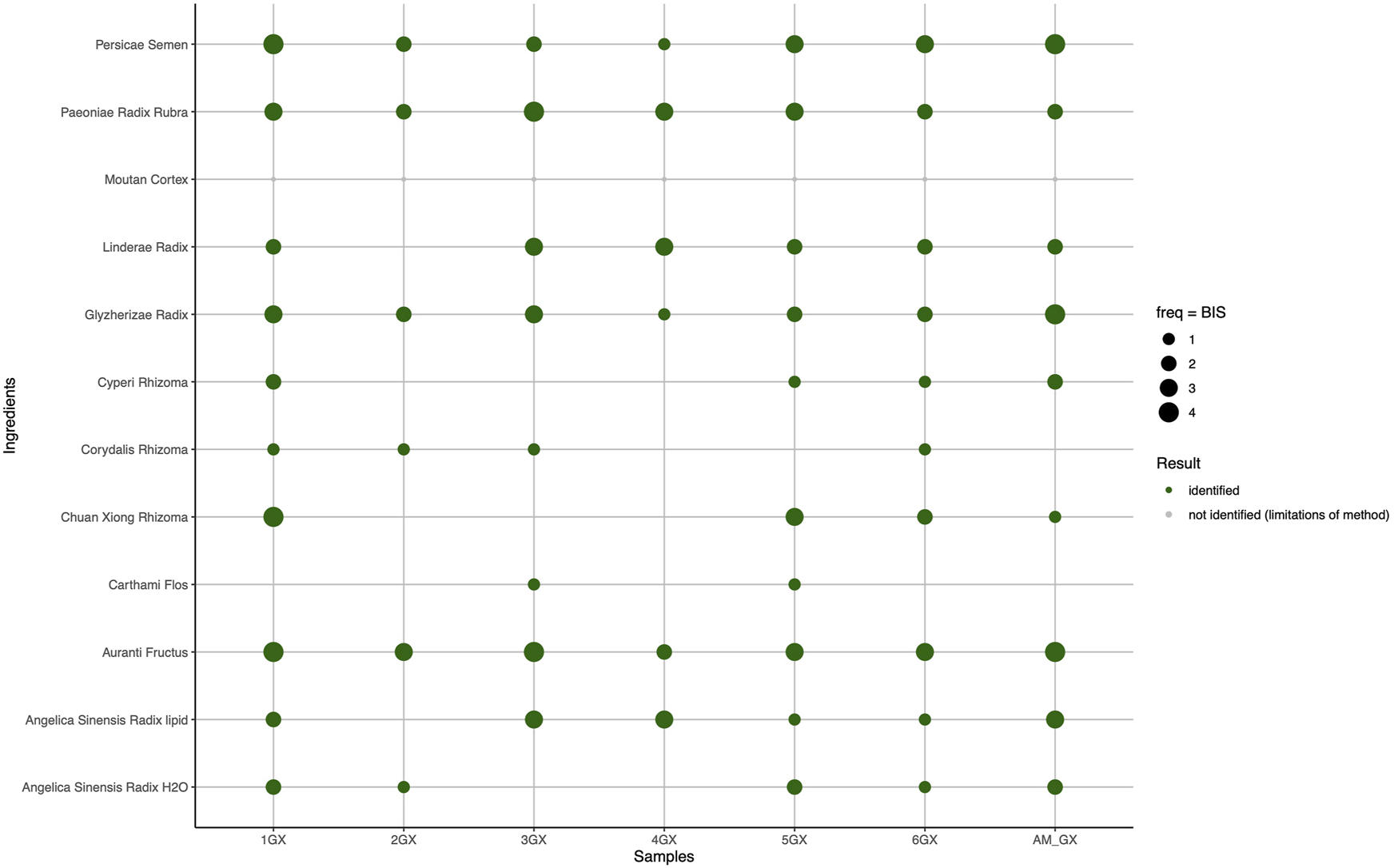 HPTLC detection of target ingredients in products and mixtures of formula Gui Zhi Fu Ling Wan (FL) based on BISs. The freq (frequency) of the dots represents the numerical score assigned (0 absent, 1 faintest, 5 most intense). The BIS is directly correlated to the identification success rate of the individual ingredients in the samples. Hence, the green dot size visualizes the scoring level of identification for target ingredients, as described in the method section. Moutan Cortex (gray) could not be determined due to the limitations of the method.