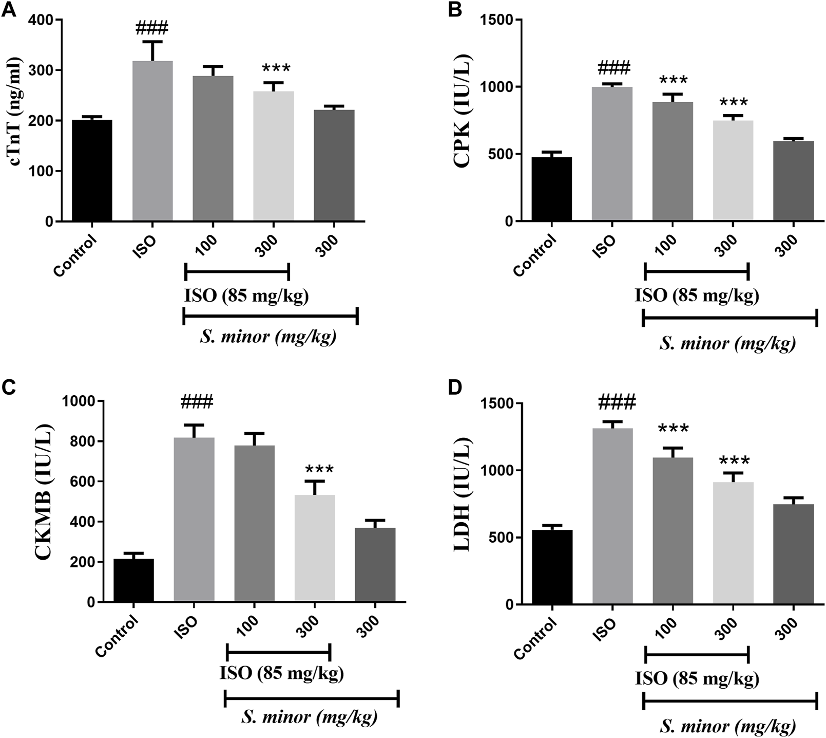 Effect of S. minor on the levels of cTn-T, CK-MB, LDH, and CPK after isoproterenol administration. The levels of cTn-T (A), CK-MB (C), CPK (B), and LDH (D) were evaluated in serum. Data were expressed as mean ± SEM. ###p < 0.001 in comparison with the control group. ***p < 0.001 in comparison with isoprenaline (85 mg/kg).