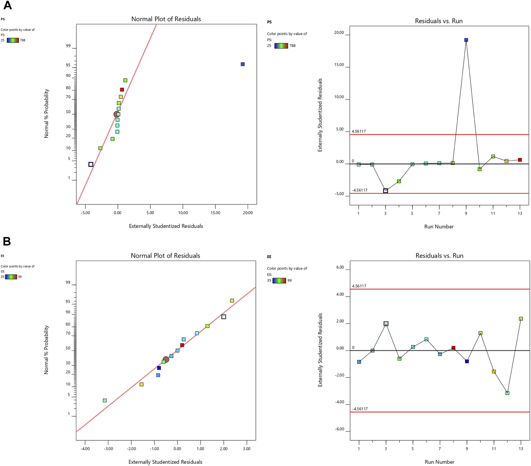 Design Expert 12 examined the quadratic response surfaces and how the different formulas were made by using a two-factor, five-level central composite design (Version 11.0, Stat-Ease Inc., Minneapolis, Minnesota, United States). This meant that 13 tests were done. Three-dimensional plots can show how two factors affect an answer and how these two factors affect each other. The usual plot of residuals shows that all of the models that were chosen were correct. In this case, the graph that could be seen was enough, so it was not necessary to use the mentioned statistical program. Statisticians can agree with the suggested model because all of the residuals for the chosen answers were more evenly distributed along a straight line. Table 2 summarizes the results for the 13 different formulas. All trial preparations had an entrapment efficiency of between 35% and 99% and a PS of between 25 and 620 nm. The results were examined, and statistical models such as ANOVA and fx were used to determine how the different factors affected each other. Based on the sum of squares (type I) and fit summary (adjusted and predicted R2 values) (see Table 2), the quadratic model was chosen for all of the results. The high-order polynomial quadratic model was chosen because the extra terms were easy to understand and the model does not overlap. For the PS and entrapment efficiency, the adjusted R2 values of 0.9593 and 0.9557 were nearly the same as the predicted R2 values of 0.8317 and 0.8429; the difference was less than 0.2. The signal-to-noise (S/N) ratio was measured with enough accuracy. Most of the time, a number more significant than 4 is better. The S/N ratios for the PS and EE were 26.5861 and 23.1059, respectively. This meant that there was more information than noise. Therefore, it was clear that the planning area was a good fit for the model. The plan was right because the model’s F-values for both answers were 29.85 and 43.35. Only 0.1% of the time could noise have caused the high F-value (ALDAWSARI et al., 2022; RIZG et al., 2022b; SREEHARSHA et al., 2022b). The coefficient of variation (CV) ensured that the plan could be used repeatedly. The accuracy of the most recent model was found to be 10% CV. The study found that the CV numbers were not too high, and this showed that the model was accurate and trustworthy. If the model does not fit well enough, it might not show all the data (Table 3). Therefore, there needs to be a lack of fit to show that the model’s equations are a good way to describe the results. The model picked for the study was good because neither of the results had a statistically significant p-value. Figure 2 shows how the factors that affected the results could be found by comparing the trial run with the residuals. Within the accepted range was a scattered trend, which showed a time-related variable in the background.