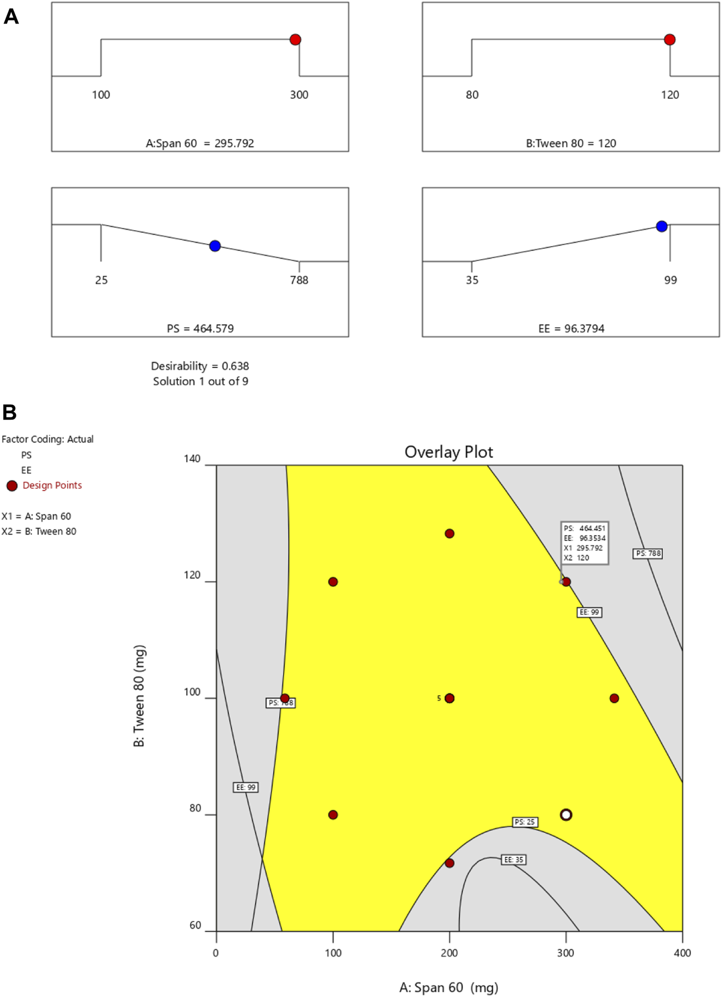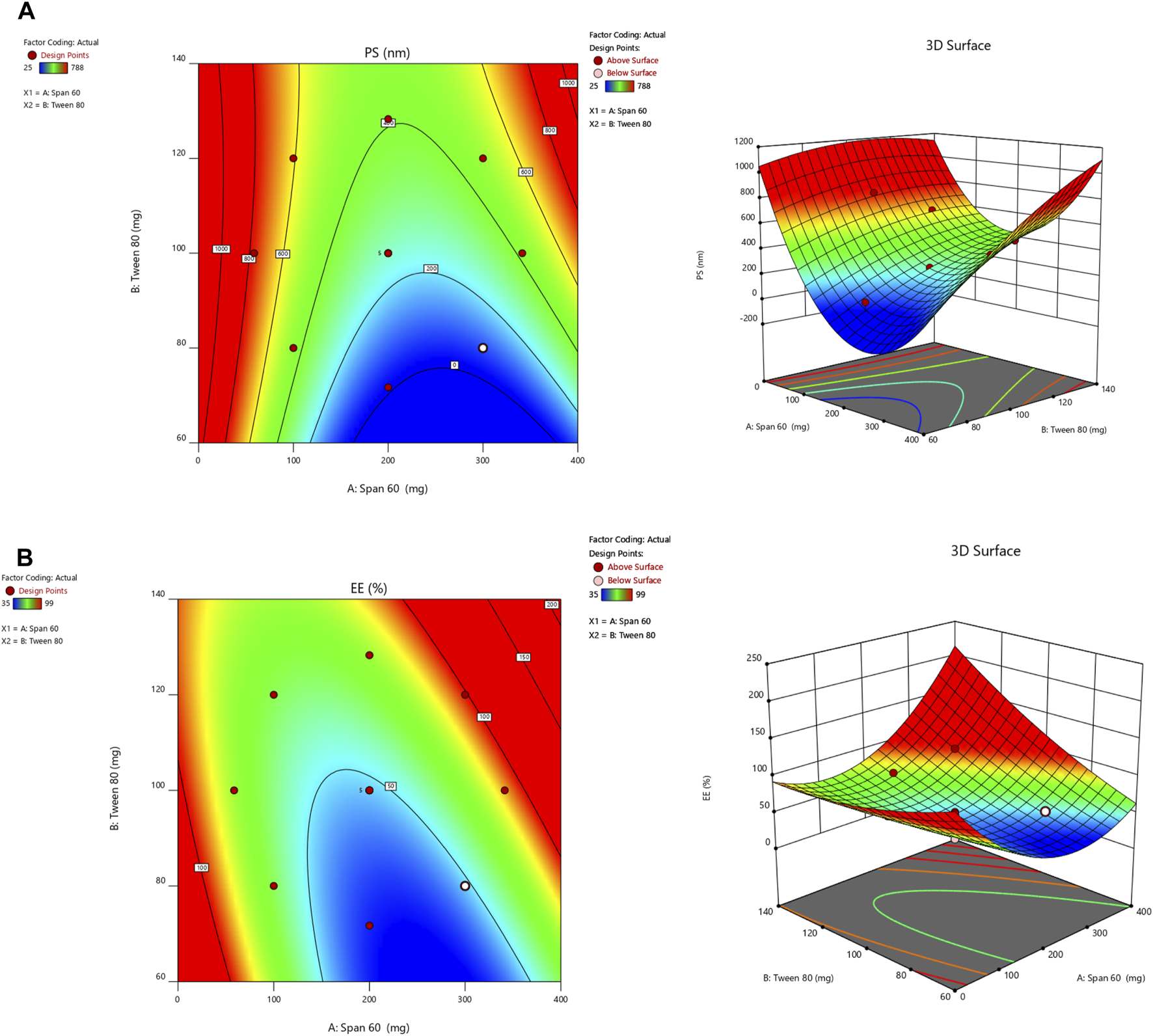 A small PS and its effect on drug delivery is one of the most important aspects of getting drugs to where they need to go. As the amount of Span 60 increases, the normal PS tends to go down. Tween 60 had a bigger effect on the PS, though. The PS got even better when Tween 80 played together more. Model terms are needed in ANOVA if the p-value is less than .0500 (ALHAKAMY et al., 2022; BAKHAIDAR et al., 2022). The model’s terms A, B, AB, and A2 were all important for the PS. The same pattern of essential factors can be seen in the EE. The experiment’s setup made it seem as though it could change the EE if all the important things worked together. Table 4 lists the ANOVA results. The 3D response graph in Figure 3A shows that high amounts of Span and least Tween can result in a smaller PS. High amounts of both factors are found in the area with the highest EE. As shown in Figure 3B.