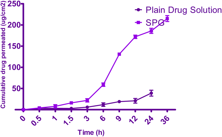 Kakkar and Kaur transformed spanlastics, which are composed of flexible nanovesicles crafted from surfactants. These structures include a nonionic surfactant and an edge activator. The surfactant molecules are arranged as a dual-layered barrier enveloping the active agent. The presence of the edge activator reduces the inter-membrane pressure, leading to the breakdown of the vesicular system’s double membrane. As the membrane disintegrates, the vesicular system becomes more pliable and capable of changing shape (FARGHALY et al., 2017). In recent years, there has been more interest in using spanlastics to improve drug transport along transtympanic, transungual, ocular, and topical routes. These flexible nanospanlastic vesicles have been a key part of improving external drug delivery, allowing for better drug penetration and controlled release of lipophilic and hydrophilic drugs over long periods. This, in turn, has made it easier for patients to follow their treatment plans, improved the effectiveness of treatments, and cut down on side effects. Ultraspanlastics can spread through the intracellular spaces of the stratum corneum and other layers of skin because they are so flexible. This makes it easier for drugs to get into the target dermal tissues quickly and increases the transdermal drug saturation. Spanlastics are very stable, especially compared with other liposomal forms. They are better able to carry medicine because they are very flexible and easy to shape. Also, unlike different formulations with cationic surfactants, they do not make patients feel uncomfortable.