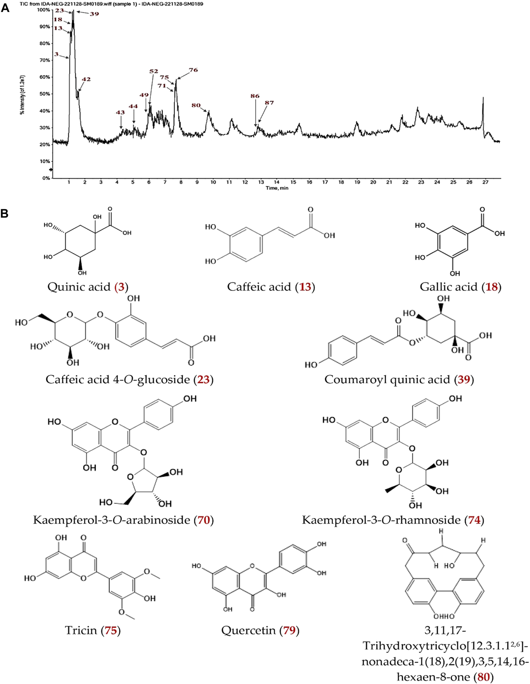 FIGURE 1. (A) LC-MS total ion chromatogram of CGBRE in negative ion mode. (B) The structure of some LC-MS identified major components of CGBRE. Numbers in red (in a and b) are related to Table 2.