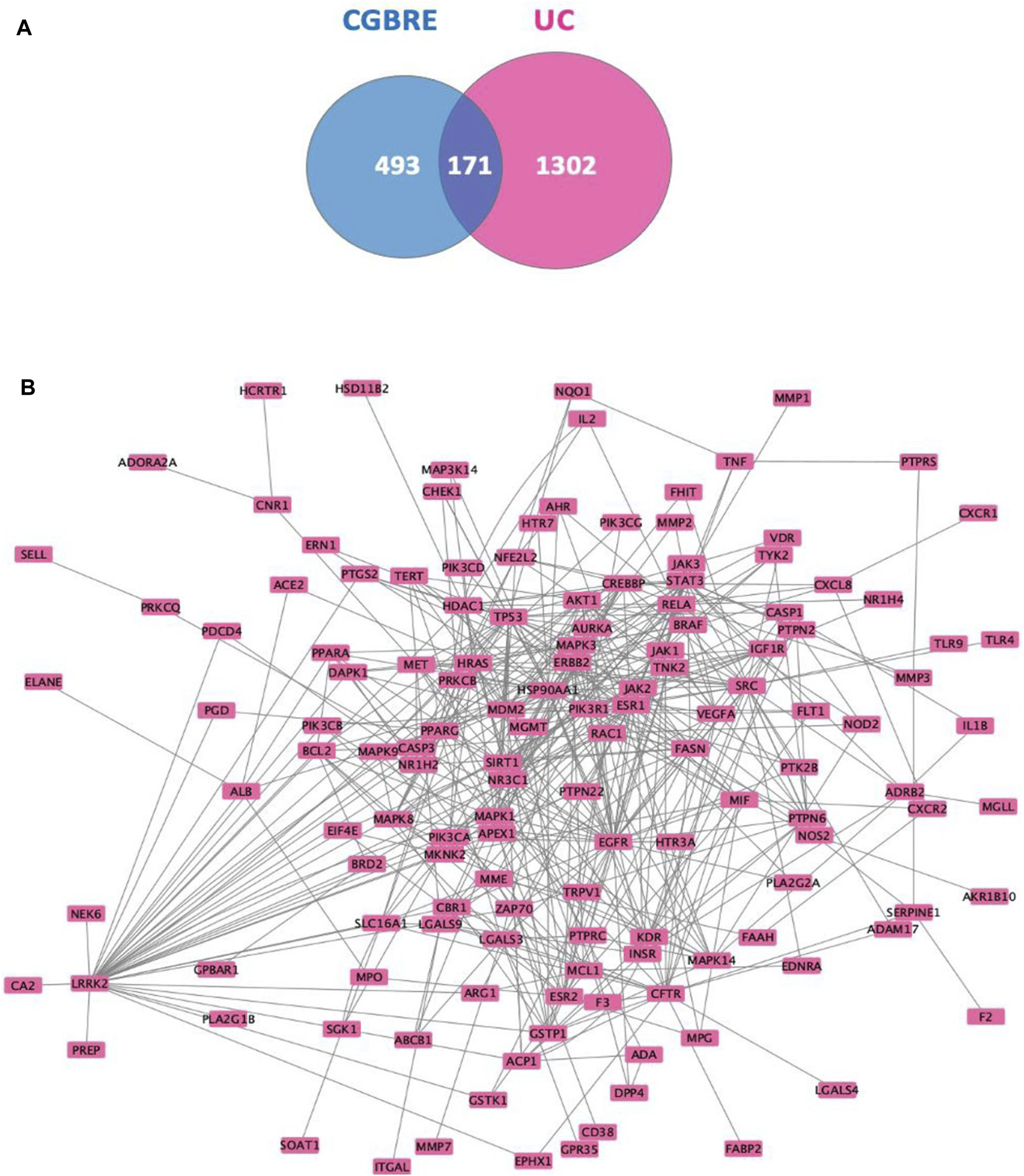 FIGURE 2. Common targets between CGBRE and UC and their PPI network. (A). Venn diagram, (B). PPI network. Abbreviations: CGBRE, Casuarina glauca branchlets ethanolic extract; PPI, protein-protein interactions; UC, ulcerative colitis.