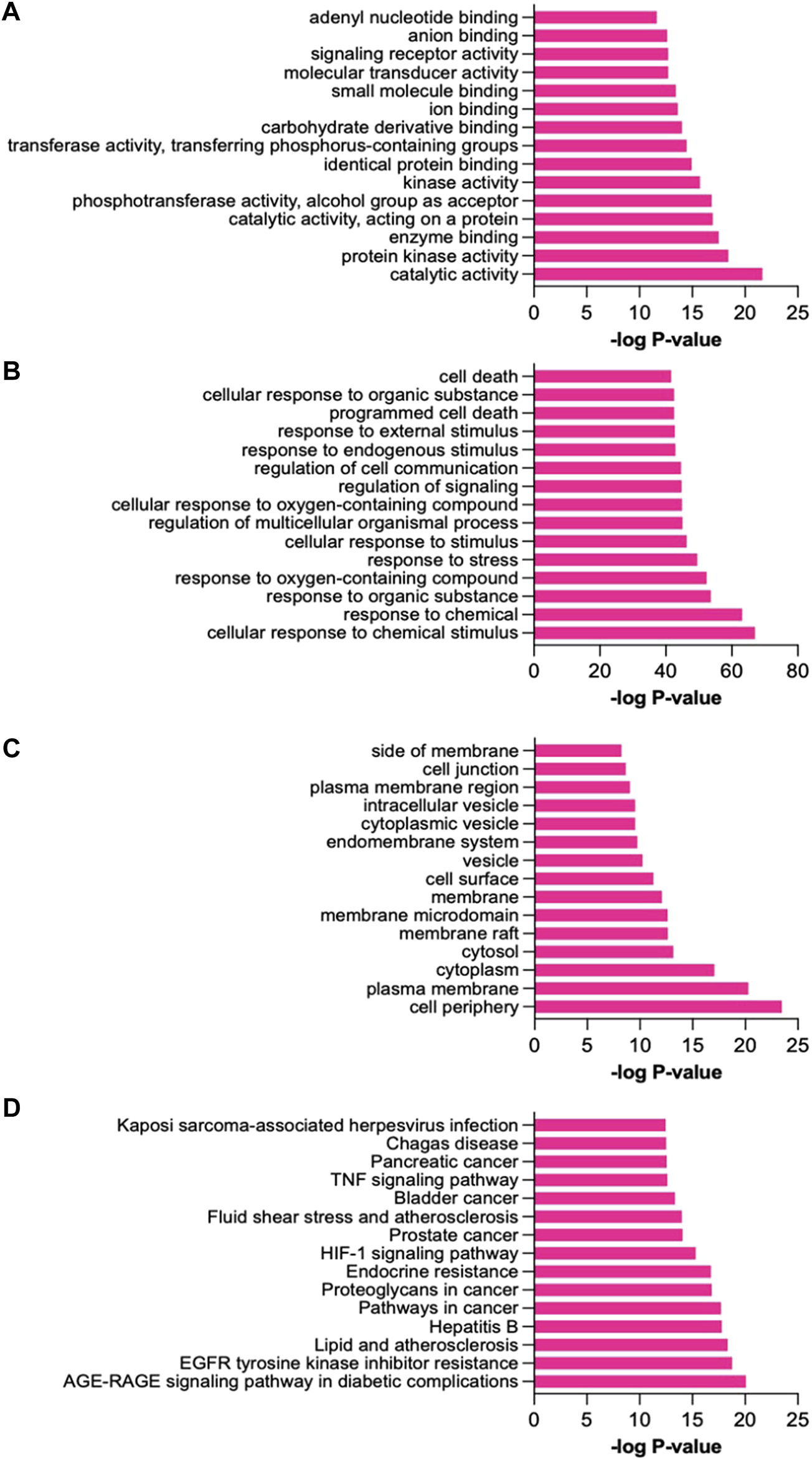FIGURE 4. Enrichment analysis. (A). Molecular functions, (B). Biological processes, (C). Cellular components, (D). KEGG pathways.