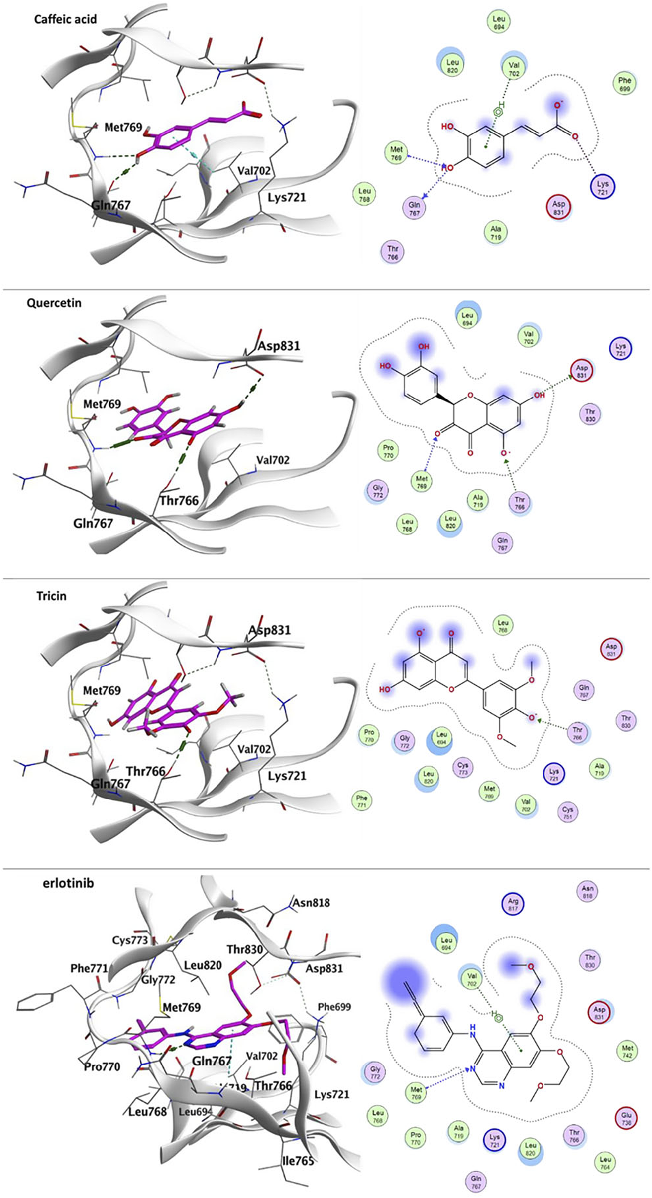 FIGURE 5. Ligand-protein binding interaction: 3D interactoin diagram of caffeic acid, quercetin and tricin, respectively with EGFR, caffeic acid, quercetin and tricin are represented as purple thick sticks, EGFR amino acid residues of the active site are shown as thin sticks. 2D interaction diagram of caffeic acid, quercetin and tricin, respectively on EGFR (PDB: 1M17). In addition to erlotinib-EGFR diagram.