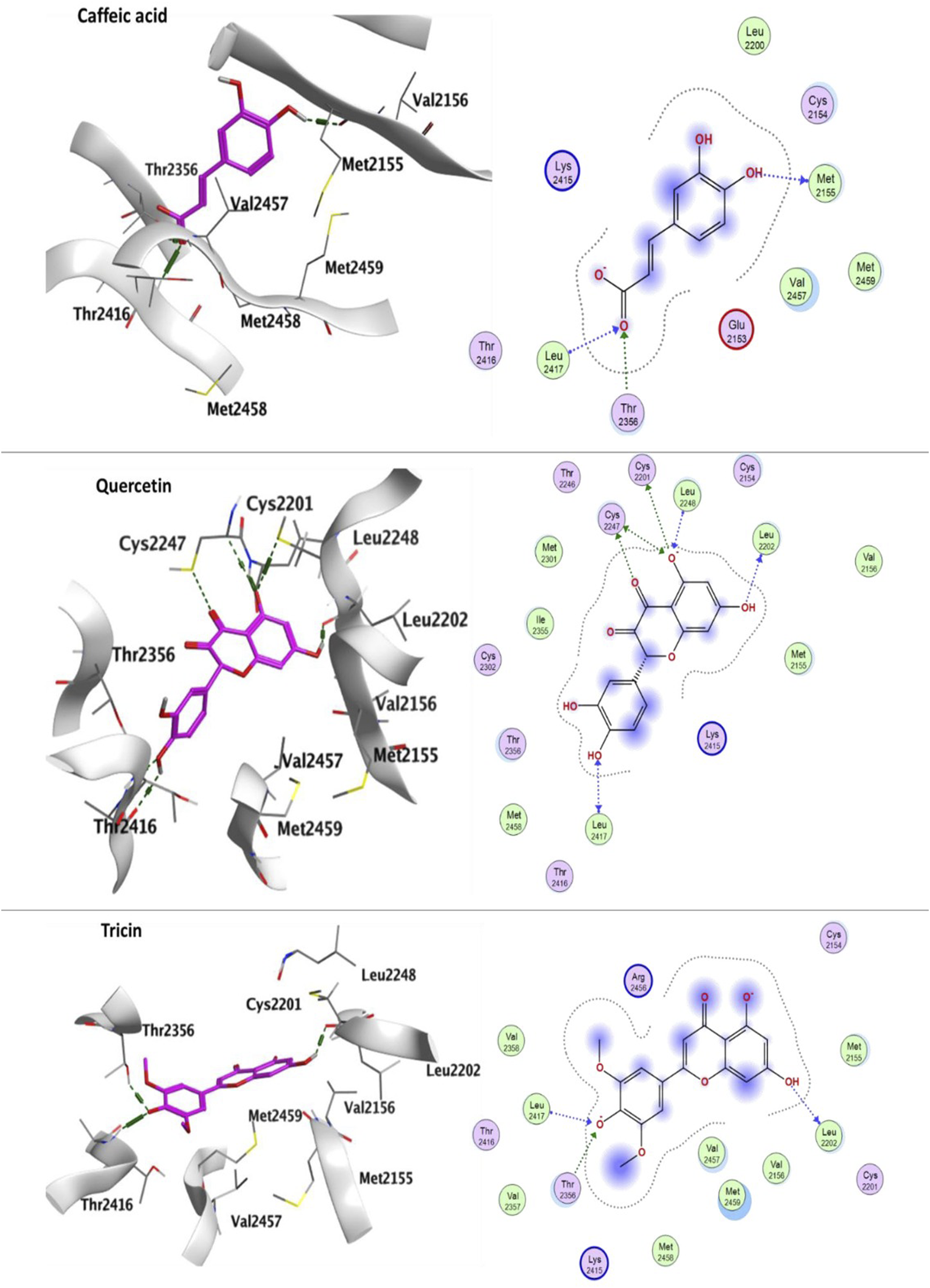 FIGURE 6. Ligand-protein binding interaction: 3D interactoin diagram of caffeic acid, quercetin and tricin, respectively with LRRK2, caffeic acid, quercetin and tricin are represented as purple thick sticks, LRRK2 amino acid residues of the active site are shown as thin sticks. 2D interaction diagram of caffeic acid, quercetin and tricin, respectively on LRRK2 (PDB: 6DLO).