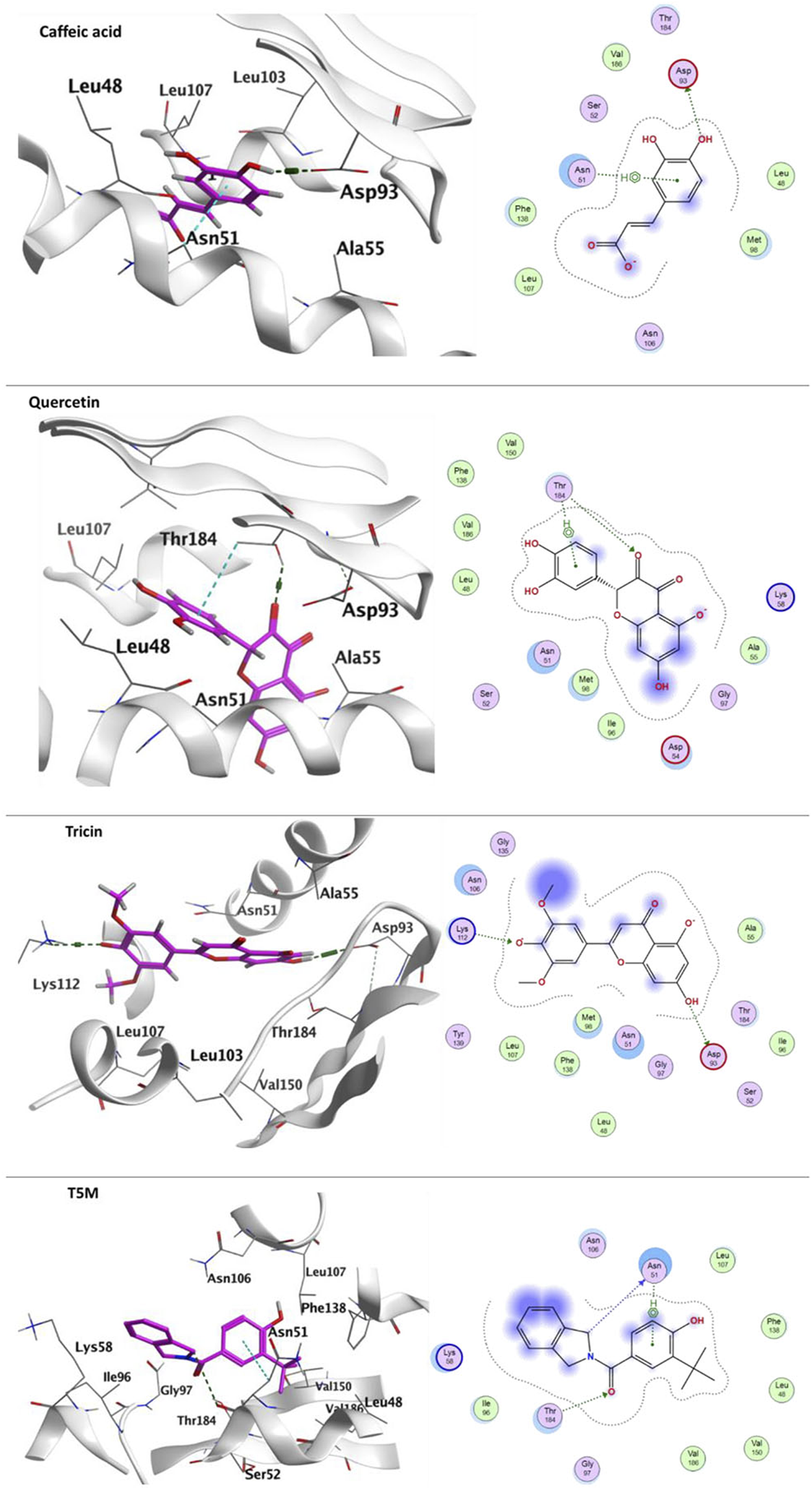 FIGURE 7. Ligand-protein binding interaction: 3D interactoin diagram of caffeic acid, quercetin and tricin, respectively with HSP90AA1, caffeic acid, quercetin and tricin are represented as purple thick sticks, HSP90AA1 amino acid residues of the active site are shown as thin sticks. 2D interaction diagram of caffeic acid, quercetin and tricin, respectively on HSP90AA1 (PDB: 2XHX). In addition to T5M- HSP90AA1 diagram.