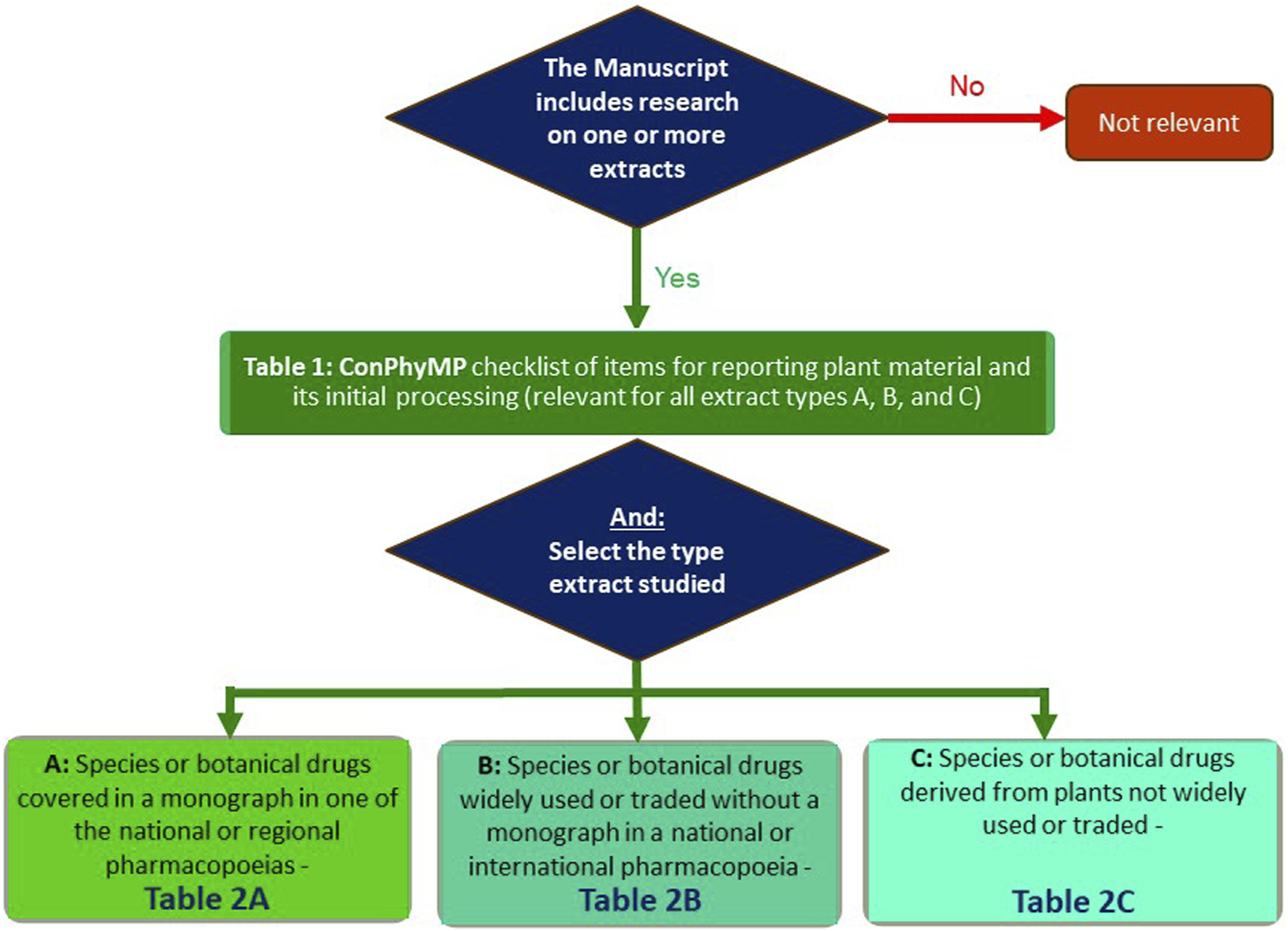 Table 1 of the tool (ConPhyMP checklist of information for reporting plant material and its initial processing) is relevant for all extract types and covers the basic requirements, including details about the species and botanical drug used, its source, initial processing extraction, and, if applicable, formulation (Heinrich et al., 2022). It is needed for all manuscripts, and we expect it to be submitted as a part of the Supporting Material. If you are studying a metabolite isolated from a plant/fungus/algae/etc., it is important to assess your manuscript against Table 1 of the tool (Figure 1).