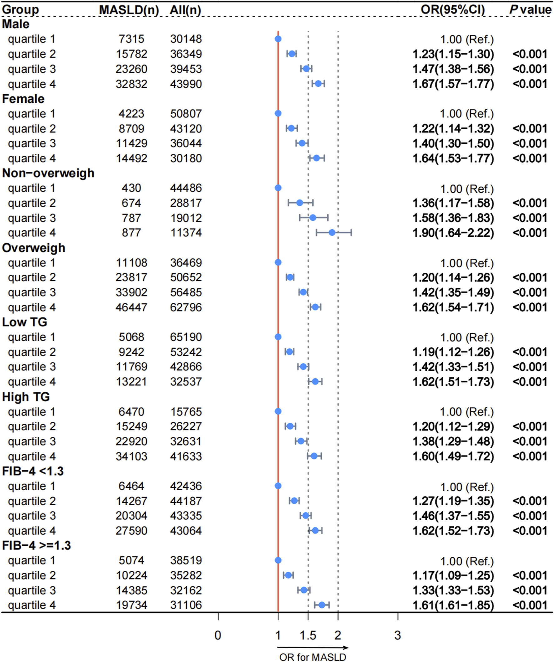 Association between reticulocyte count quartiles and MASLD in subgroups according to the cross-sectional analysis. MASLD: metabolic dysfunction-associated steatotic liver disease; TG: triglyceride; FIB-4: fibrosis-4; OR: odds ratio; CI: confidence interval.