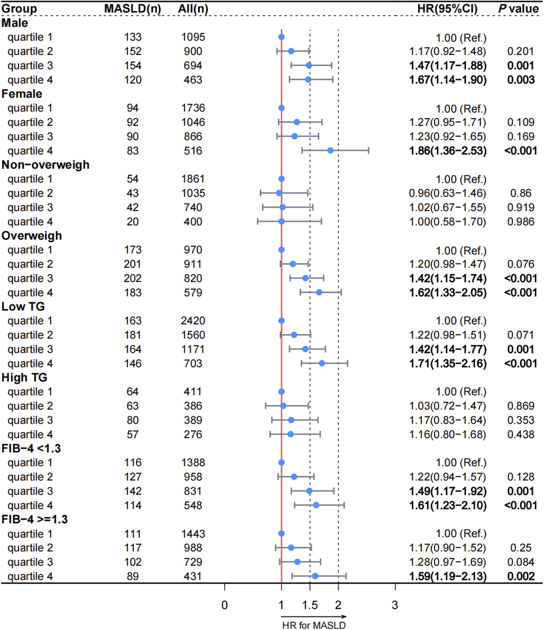 Association between reticulocyte count quartiles and MASLD in subgroups according to the prospective analysis. MASLD: metabolic dysfunction-associated steatotic liver disease; TG: triglyceride; FIB-4: fibrosis-4. HR: hazard ratio; CI: confidence interval.