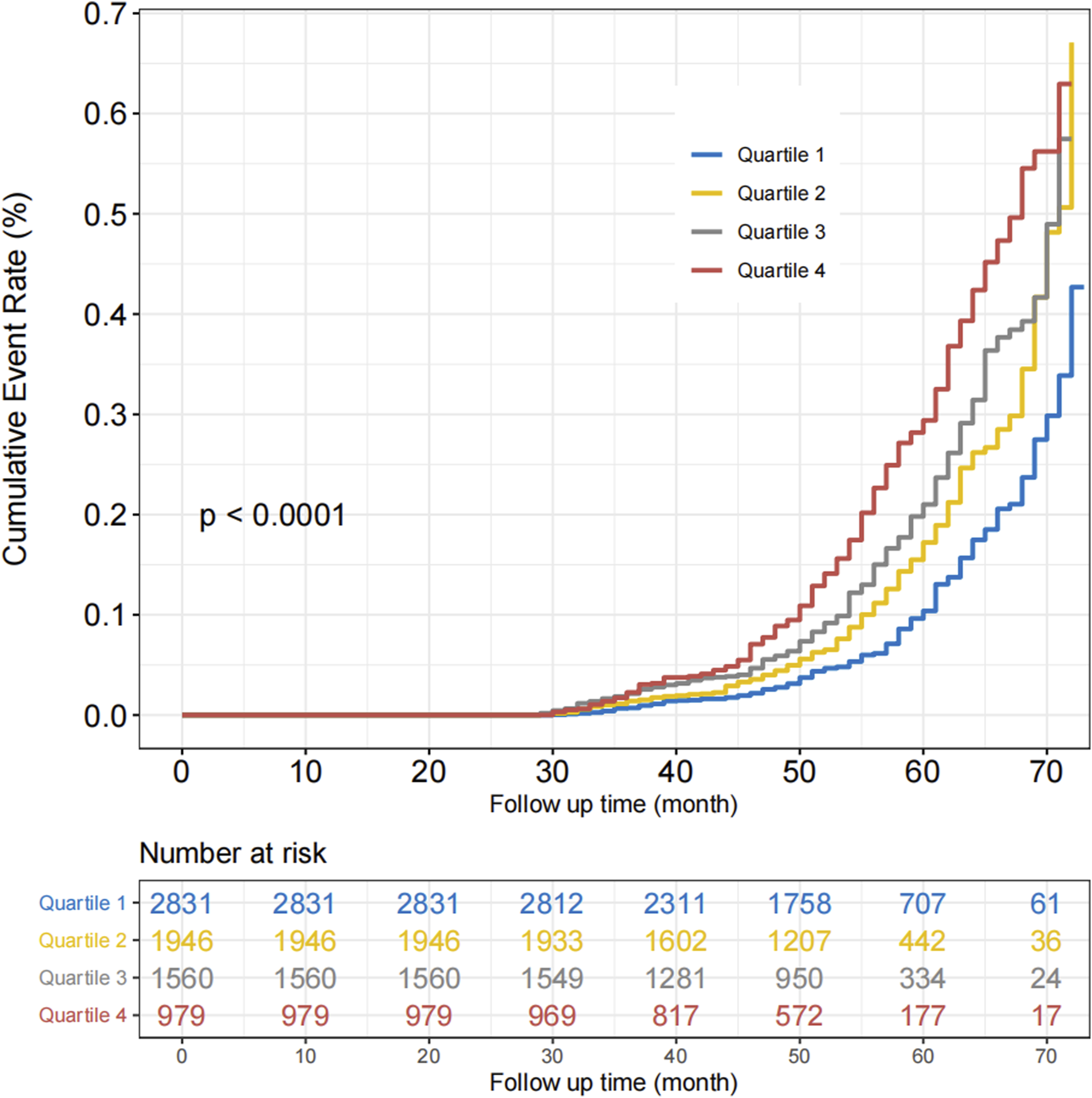 | Quartile 4 | 3.03 | 2.50–3.66 | <0.001 | 1.84 | 1.52–2.22 | <0.001 | 1.83 | 1.51–2.22 | <0.001 | 1.55 | 1.28–1.89 | <0.001 | |