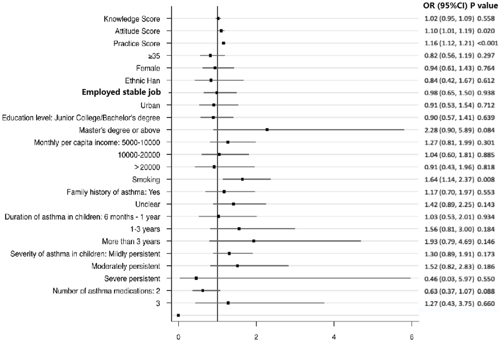 Figure 1. Multivariable analysis of medication adherence. References: <35 years old, female, minority, non-fixed job, rural, high school or below, <5000 CNY, no smoking, no family history of asthma, duration of asthma in children <6 months, severity of asthma in children (intermittent), and a number of asthma medications (Global Initiative for Asthma, 2023).