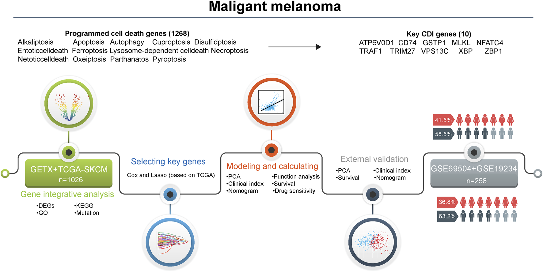 We analyzed 13 PCD modes including apoptosis, necroptosis, ferroptosis, pyroptosis, netotic cell death, entotic cell death, lysosome-dependent cell death, parthanatos, autophagy-dependent cell death, oxeiptosis, disulfidptosis, and alkaliptosis. These modes were used to construct a model that incorporated genes related to these 13 PCD modes to establish a cell death index (CDI) to conduct prognosis analysis. Transcriptomic, genomic, and clinical data were collected from cohorts including TCGA-SKCM, GSE19234, and GSE65904 to validate this model.