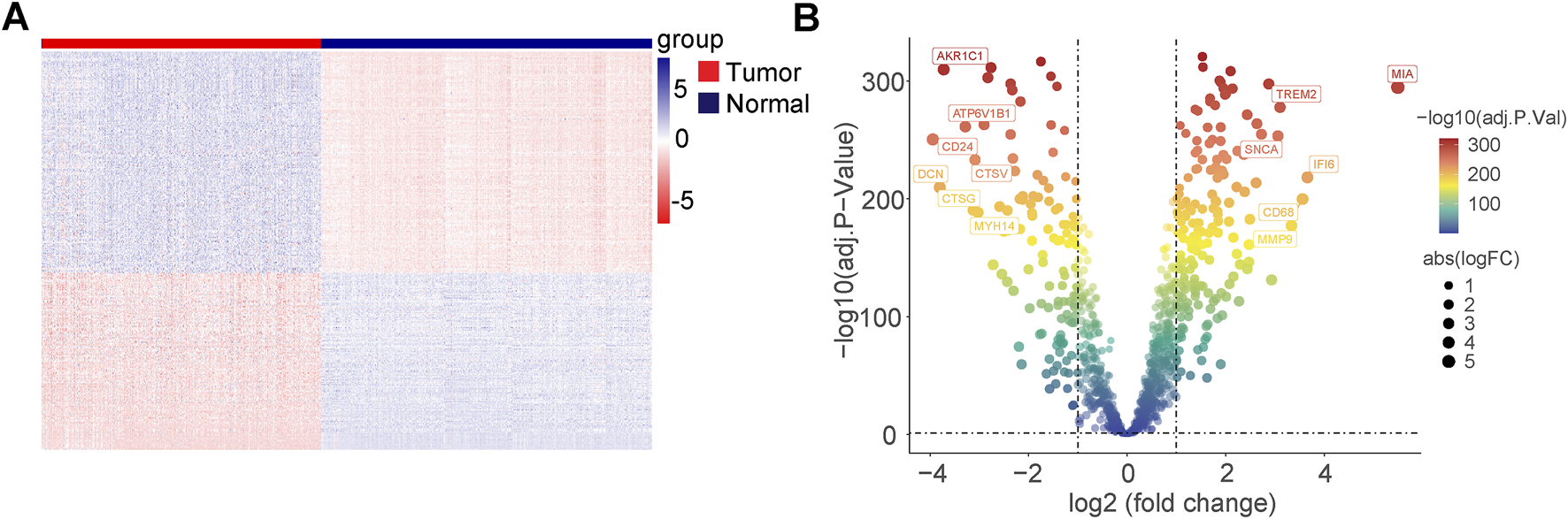 Differentially expressed genes (DEGs) related to programmed cell death in TCGA cohort and GTEx cohort. (A) Heatmap of the PCD-related DEGs between malignant melanoma and normal tissues. (B) Volcano plot of the PCD-related DEGs between malignant melanoma and normal tissues (two vertical lines indicate gene expression fold change >1 and <−1, respectively, and the horizontal line indicates the P-value of 0.05; points with labels are obvious DEGs which |log2FC| > 3).