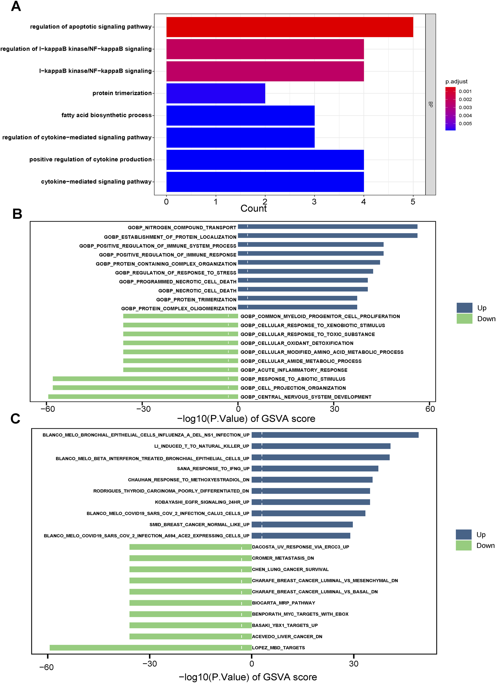 Plot of enrichment biological functions between two CDI groups in TCGA cohort. (A) GO enrichment analyses based on the 10 model genes. (B, C) GSVA between two CDI groups in TCGA cohort. Abbreviations: GVSA, gene set variation analysis.