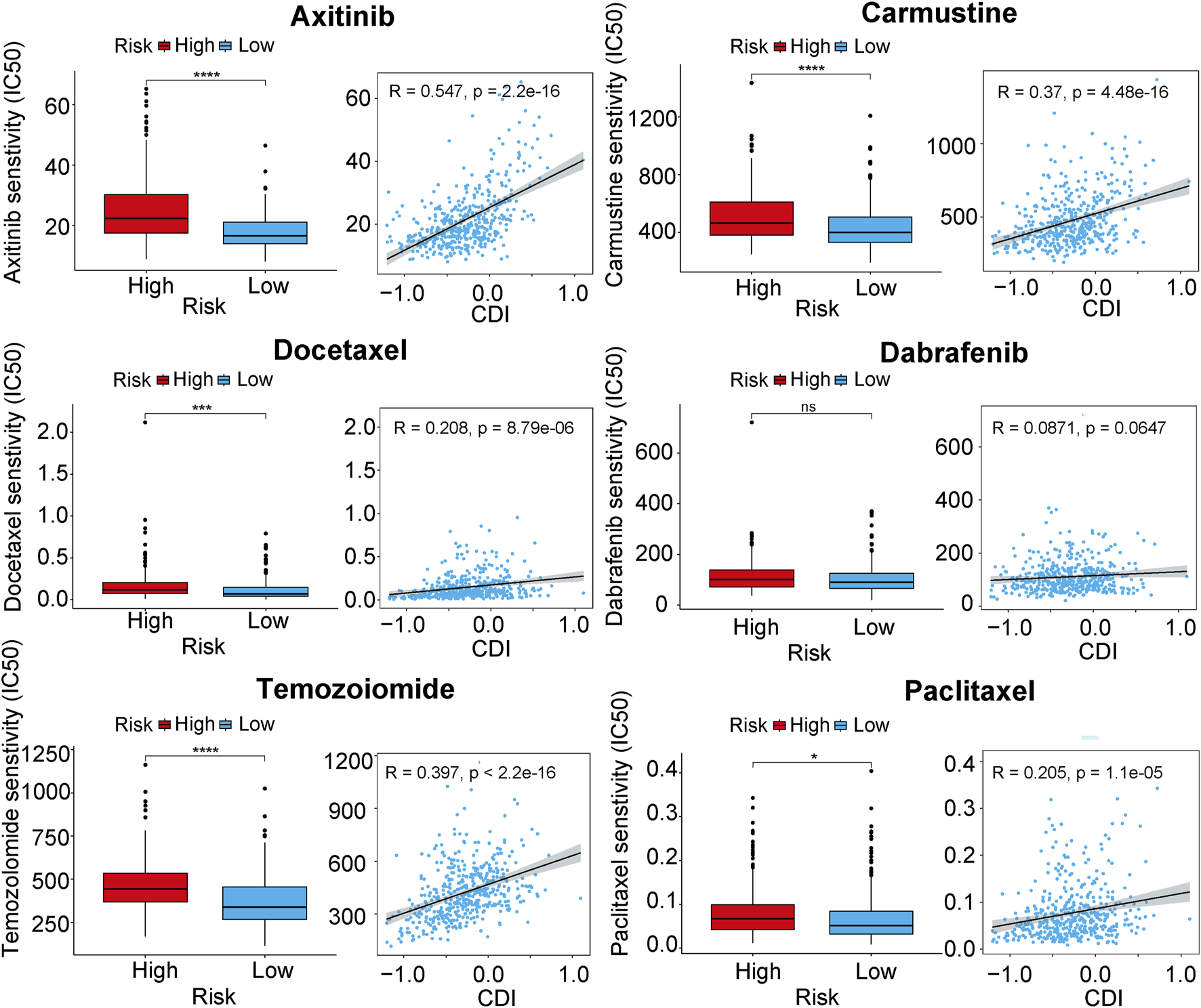 We conducted an analysis to determine whether there were differences in other important features between the two CDI groups. We calculated the half maximal inhibitory concentration (IC50) values of commonly used melanoma drugs to explore the relationship between the established model and drug sensitivity. The scatter plots and box plots of the correlation and significance between drug sensitivities and CDI for six commonly used melanoma drugs (Axtinib, Carmustine, Docetaexl, Temozolomide, Paclitaxel, Dabrafenib) are presented in Figure 7. We found that the IC50 values of these drugs were higher in the high-CDI group, which may suggest that melanoma patients with high CDI are resistant to standard chemotherapy regimens and result in poor prognosis. This finding is also consistent with previous results.