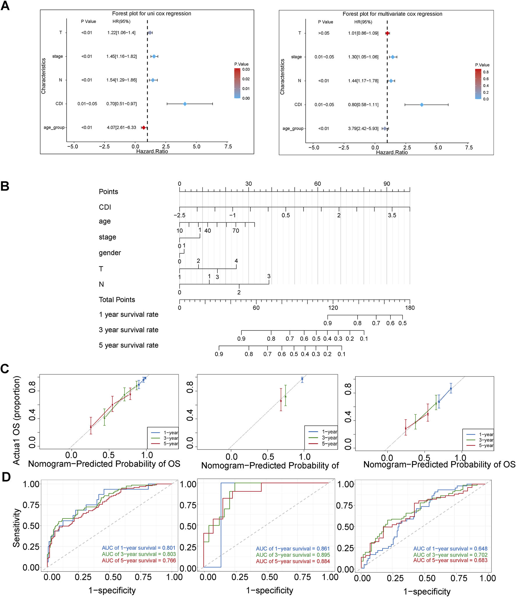Establishment and assessment of the nomogram survival model. (A) Univariate analysis and multivariate analysis for the clinicopathologic characteristics and CDI in TCGA cohort. (B) A nomogram was established to predict the prognostic of malignant melanoma patients in TCGA cohort. (C) Receiver operator characteristic (ROC) analysis of nomogram in TCGA, GSE19234, and GSE65904 cohorts. (D) Calibration plots showing the probability of 1-, 3-, and 5-year overall survival in TCGA, GSE19234, and GSE65904 cohorts.