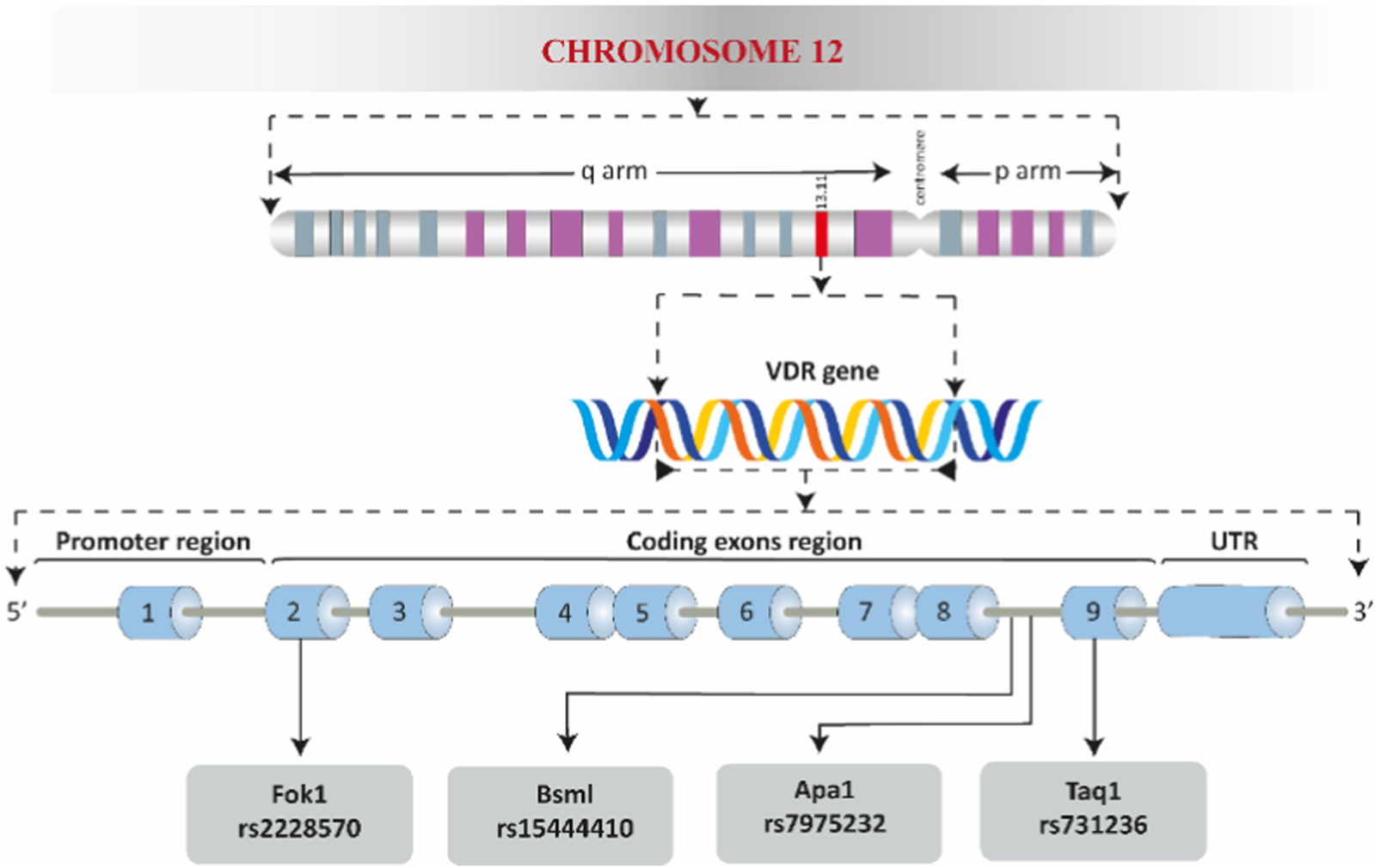 A schematic overview of the human VDR. The promoter region, coding exons region, the three prime untranslated region (UTR), and the well-known polymorphic sites are shown.