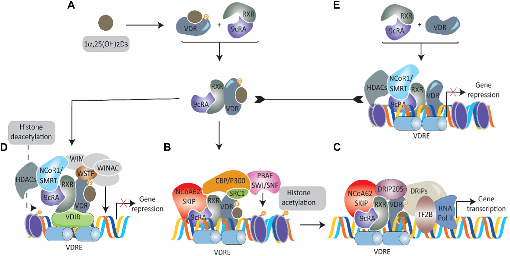Overview of VDR transcriptional signaling. (A) A schematic representation of 1α,25-dihydroxy vitamin D3 [1α, 25 (OH)2D3]-induced activation of cytosolic VDR. On binding, VDR complexes with the retinoid-X-receptor coupled with 9-cis-retinoic acid (9cRA) and moves into the nucleus. (B) In the nucleus, the 1α, 25 (OH)2D3-VDR-RXR-9cRA complex binds to nuclear vitamin D response elements (nVDRE) and recruits several coactivators [nuclear coactivator—62 kDa-Ski-interacting protein (NCoA62-SKIP), steroid receptor coactivators (SRC1), CREB binding protein-p300 (CBP/p300), and SWI-2-related gene 1 associated factor (PBAF-SNF)] to promote histone acetylation and unwrap chromatin. (C) The mediator complex VDR-interacting proteins (DRIPs) are brought in by binding VDR-interacting protein 205. Transcription initiation is triggered by transcription factor 2B (TF2B) and RNA polymerase II. (D) In certain situations, transcriptional activation is prevented in 1α, 25 (OH)2D3 presence. This happens when 1α, 25 (OH)2D3-VDR-RXR-9cRA complex binds to a VDR-interacting repressor (VDIR) recognized by nVDRE, resulting in the dissociation of histone acetyltransferase (HAT) coactivators and the association of corepressors NCoR1/SMRT with histone deacetylase (HDAC) activity. The subsequent recruitment and interaction with the Williams syndrome transcription factor (WSTF) hinder gene transcription expression via the multifunctional ATP-dependent chromatin-remodeling complex (WINAC). (E) VDR that is not bound to 1α, 25 (OH)2D3 and is linked to RXR-9cRA moves into the nucleus and then binds to nVDRE. With the help of corepressors (NCoR1/SMRT) with histone deacetylase activity, transcription is inhibited.