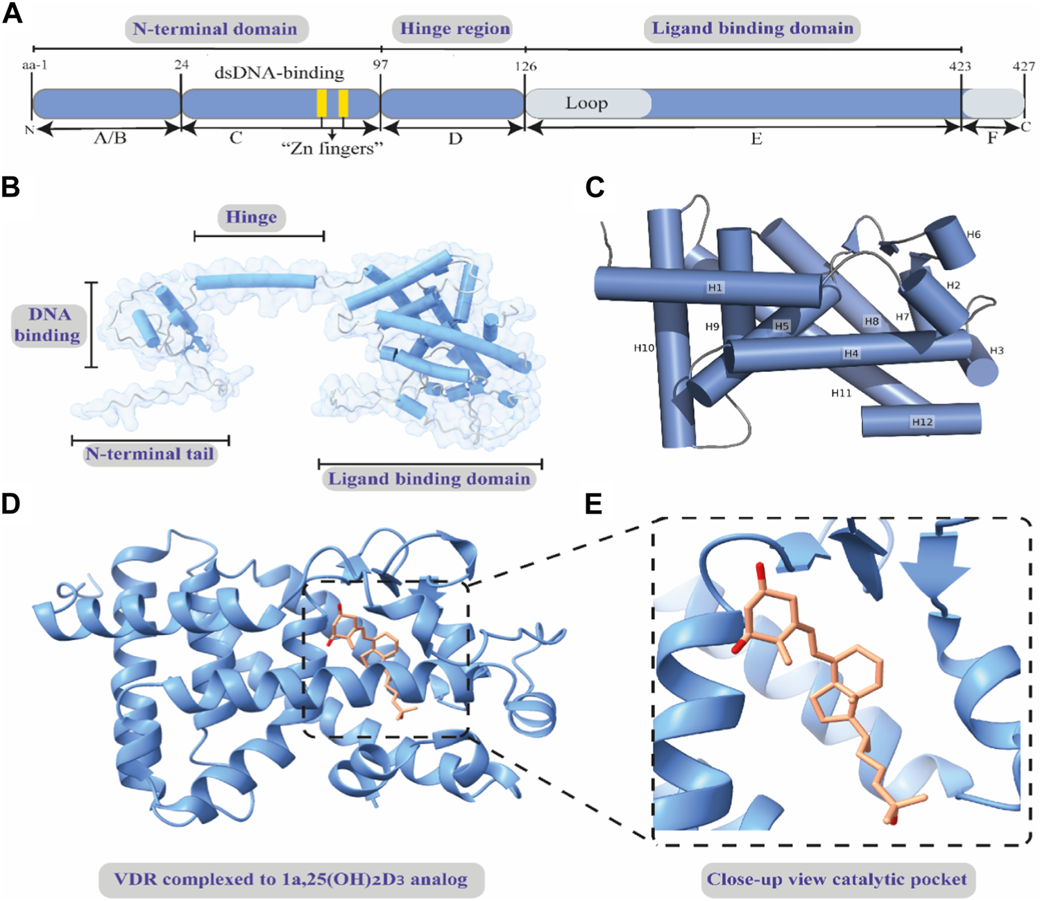 Basic structural features of human VDR. (A) Diagram of the functional domains of the human VDR. (B) The full-length 3-dimensional structure of apo-human VDR, showing the functional domains. (C) A close view of the crystal structure of the ligand-unbound ligand-binding domain of VDR. The α-helices are shown as cylindrical and numbered from H1-H12. (D) A cartoon representation of the ligand-binding domain of human VDR bound to 1α,25-dihydroxy vitamin D3 analog. (E) A magnified view of the binding site showing the binding mode of the inset ligand 1α,25-dihydroxy vitamin D3 analog. Full-length apo-human VDR (alpha fold model); Crystal structure of apo-human VDR ligand-binding domain (PDB ID: 3A78); and crystal structure of the nuclear receptor for vitamin D ligand binding domain bound to 1α,25-dihydroxy vitamin D3 analog (PDB ID: 1IE9).
