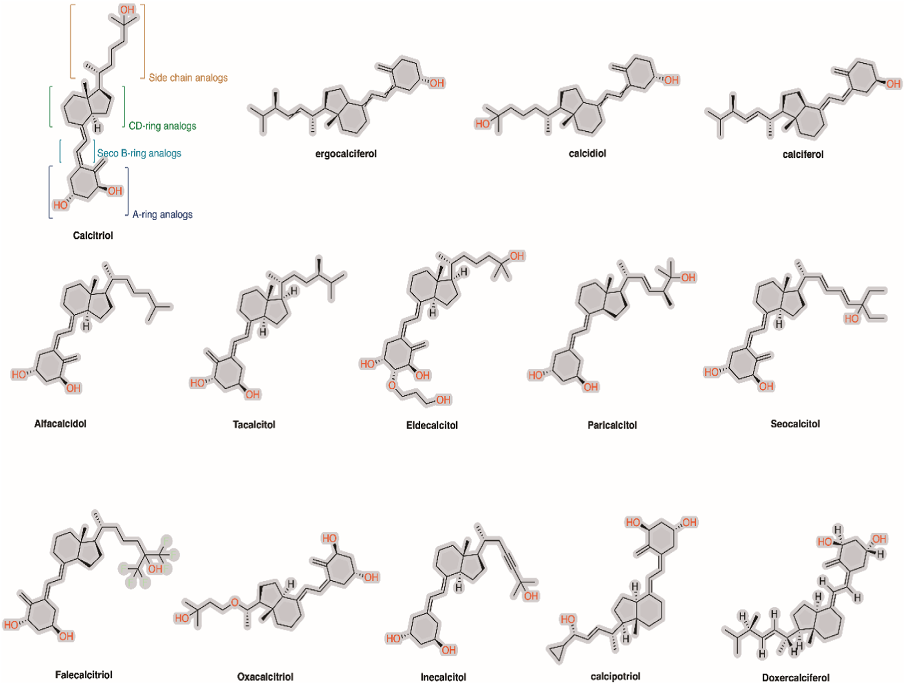 Chemical structure of 1α,25-dihydroxy vitamin D3 and its analogs on the market.