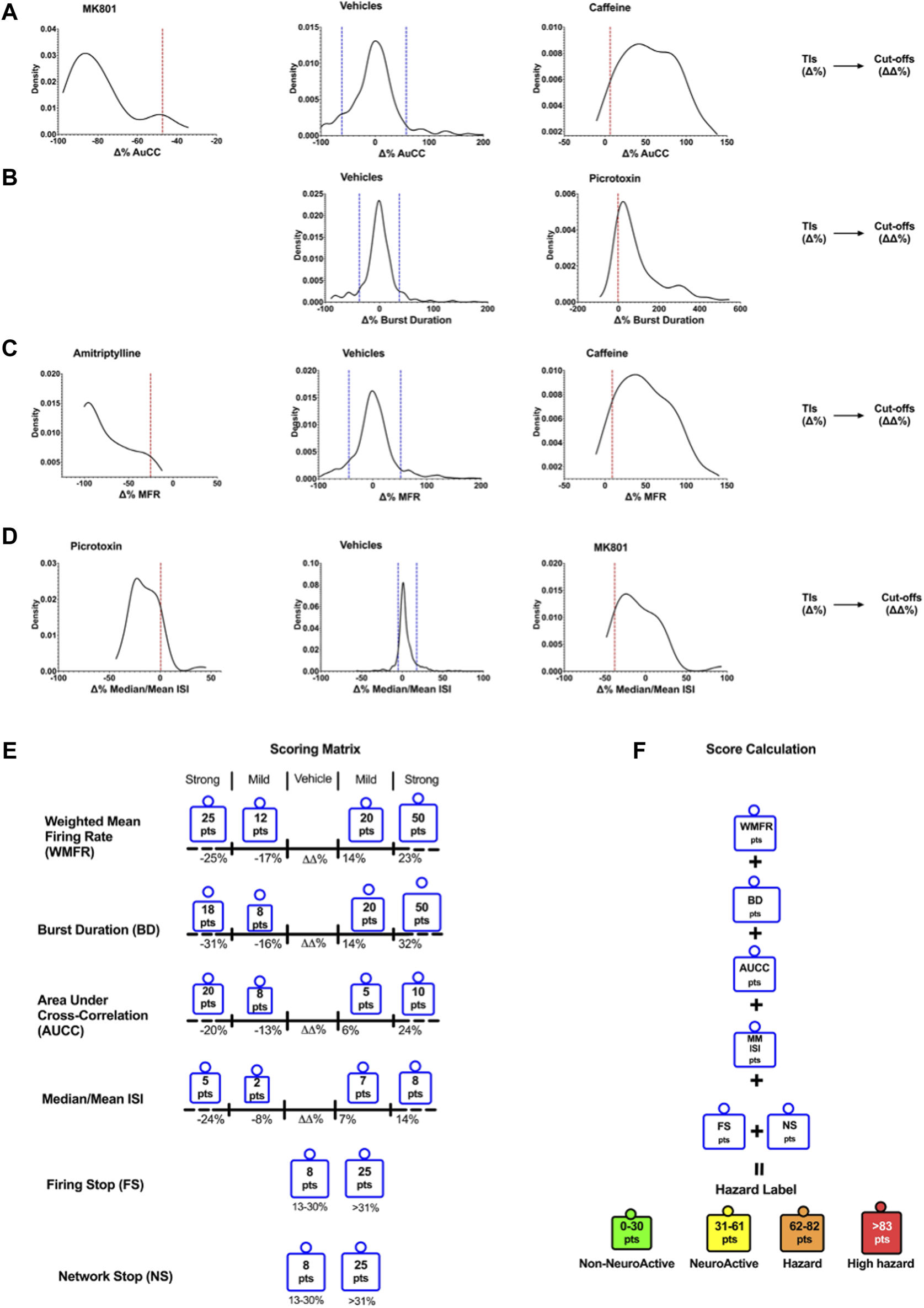 Figure 2. Density plots show the TIs for vehicles and positive controls calculated for the six selected key parameters. Determination of Cutoffs using TIs to develop the scoring matrix. Examples of the TIs of compounds on AuCC (A), the burst duration (B), the weighted mean firing rate (C), and the median/mean Inter-Spike Interval (ISI) (D). The blue line corresponds to the upper and lower bound Tis for the vehicle, and the red line corresponds to the upper and lower bound Tis for the compounds. (E) The scoring matrix represents a point card where for each parameter a weighted score is given depending on the size and direction of the ΔΔ% effect. (F) Calculation of hazard scorings is done through a sum of points across all six parameters.