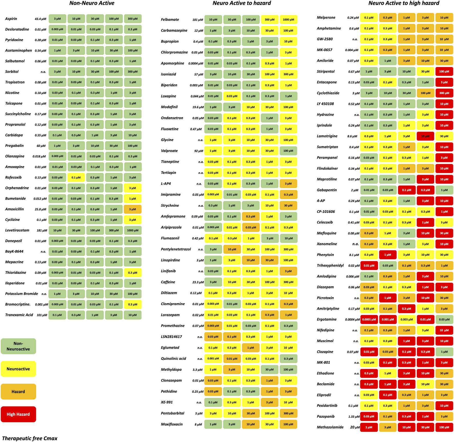 Figure 3. Effect of representative 106 reference drugs on the rat cortical neurons measured on the MEAs using the hazard score system defined by the electrophysiological changes per concentration. Concentrations were selected based on the therapeutic-free Cmax (shown in italics). n. a., not available. Green: no risk (non-neuronal active), yellow: neuronal active; Orange: hazard, and Red: high hazard.