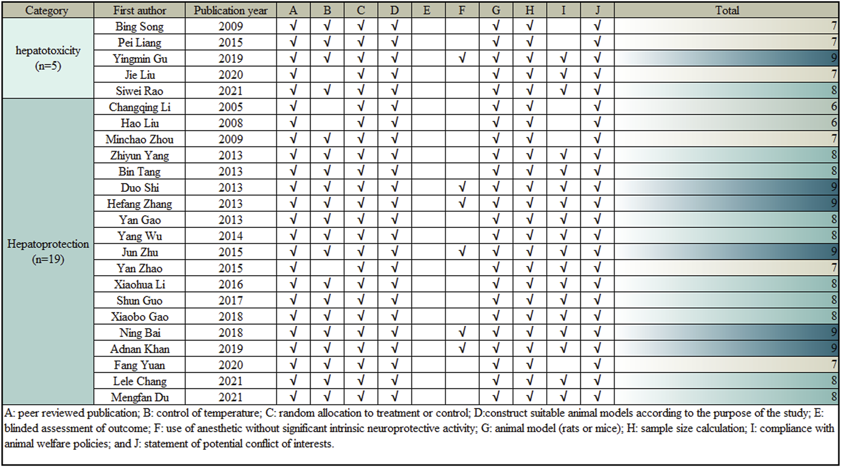 Excluded criteria for the research of hepatoprotection: 1) LI rats or mice were not selected as animal subjects for hepatoprotection studies. 2) The experiments did not form controls. 3) The I group did not receive MT monotherapy. The C group used functional drugs (including Western medicines, TCMs and integrative medicines) as interventions, and could not provide specific outcome indices. 4) The common indicators of LI were not included in the study. 5) Quality evaluation results below 5 points.
