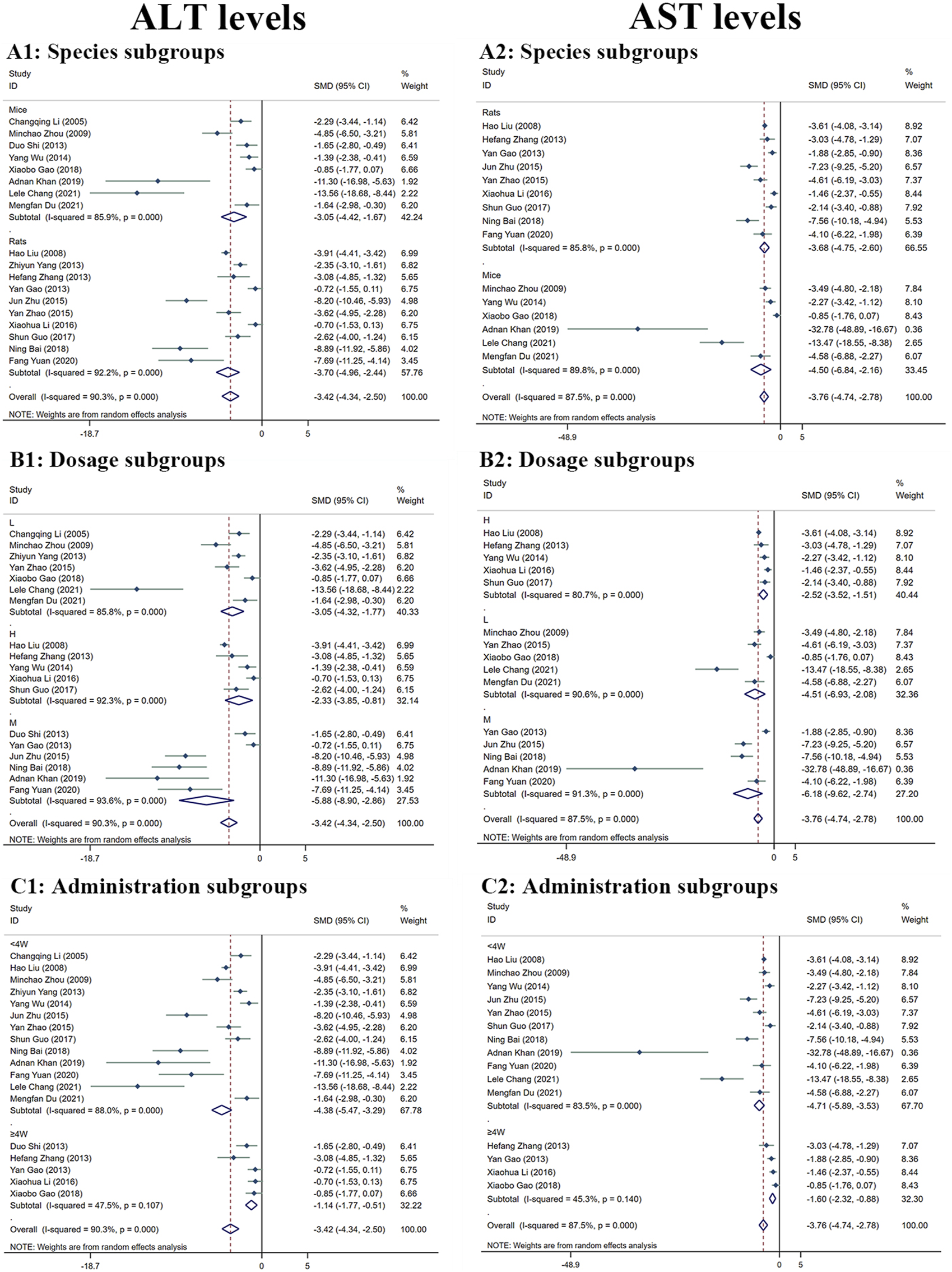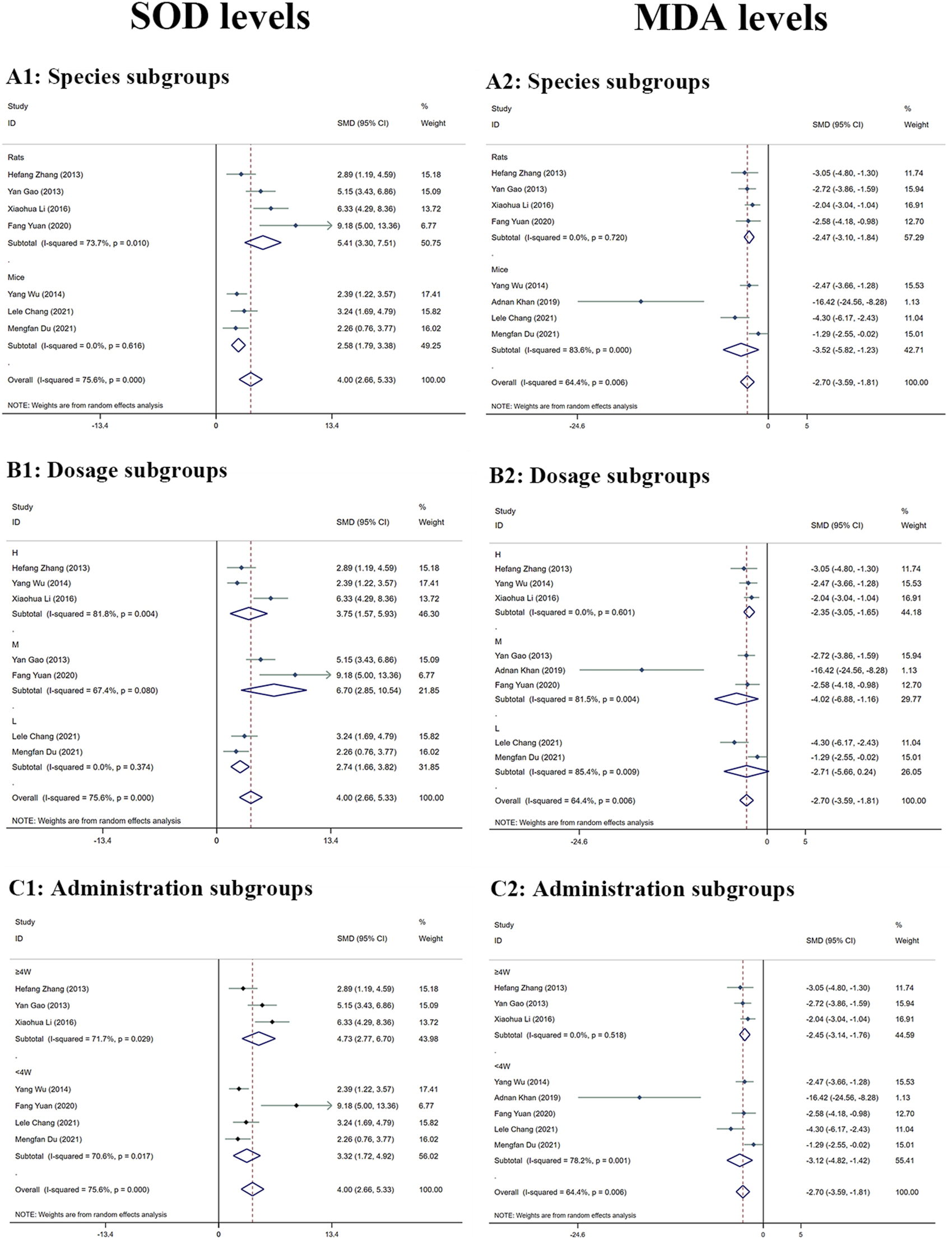 Statistical analysis of indicators in this study was conducted using STATA 16.0 software. When the results are statistically significant, the p-value should be less than 0.05 (p < 0.05). Results were quantified using the standardized mean differences (SMD) and accompanying 95% confidence intervals (95% CI). The I-squared (I2) test was used to assess the degree of heterogeneity and consistency between research (random-effects model [I2>50%] or fixed-effects model [I2 ≤ 50%]). Results were deemed to exhibit significant heterogeneity when I2 exceeded 50%. Investigators conducted subgroup analyses for animal species (rat, mouse), dose administered (low (L)≤25 mg/kg, 25<medium (M)≤50 mg/kg, high (H)>50 mg/kg), and time of administration (<4w, ≥4w) in order to identify the source of heterogeneity. To establish whether the findings were trustworthy enough to draw inferences, sensitivity analysis was done.